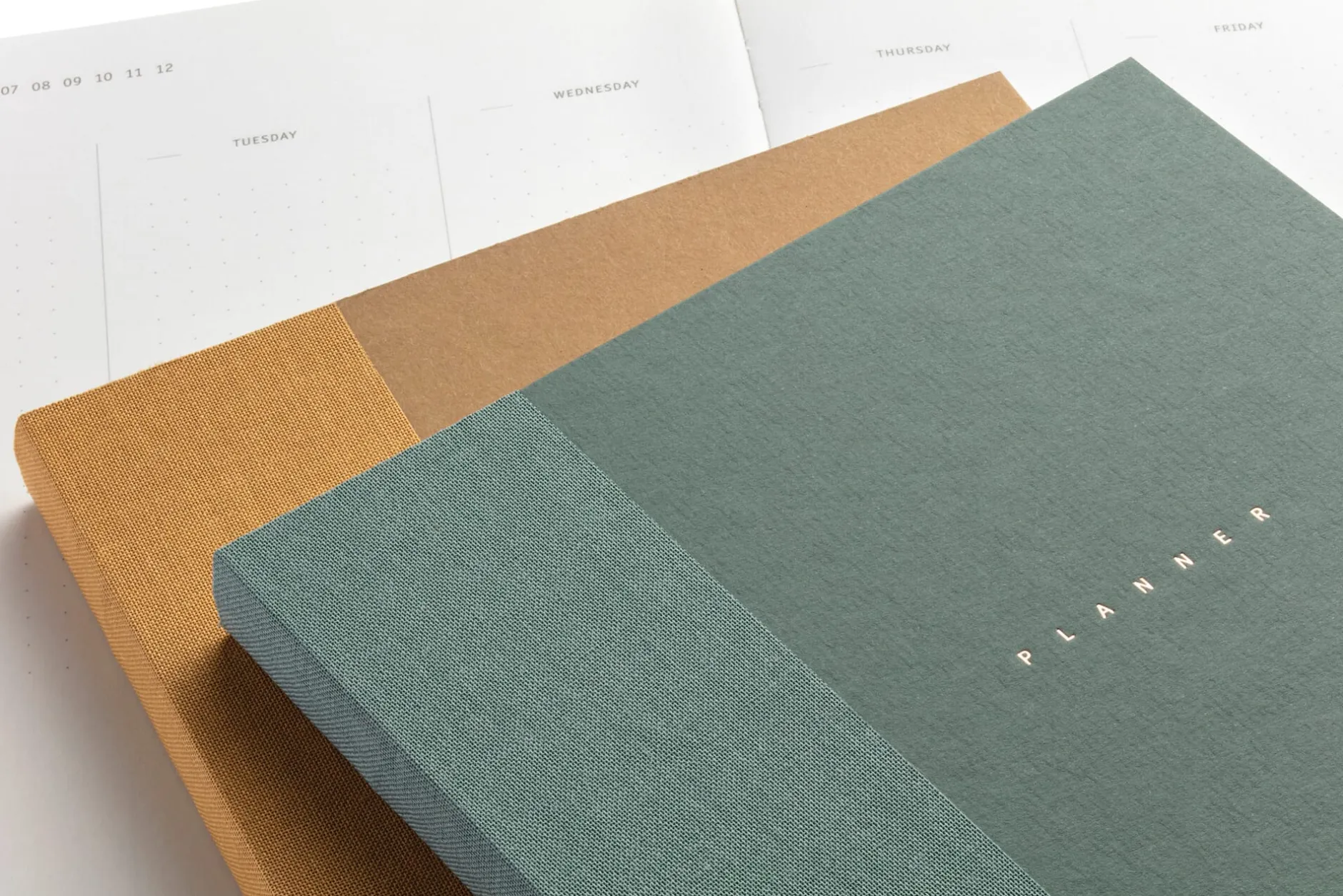 Fadengehefteter Wochenkalender (undatiert) mit Halbleineneinband. Deckel aus durchgefärbtem Karton mit Heißfolienprägung. 15,2 × 20,5 cm. 160 Seiten. Zartweißes, tintenfestes Papier (100 g/qm). Mit Zeichenband. Hergestellt in Polen.