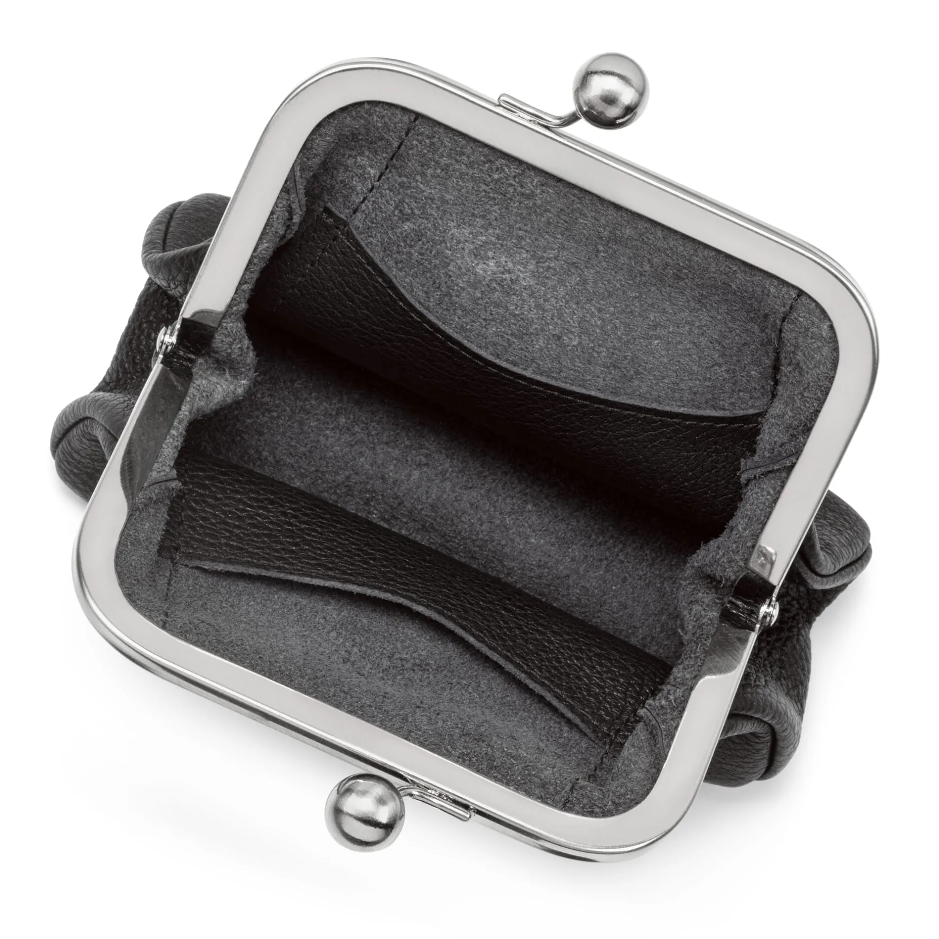 Sie lediglich als Geldbörse zu verwenden, würde ihr nicht gerecht. Denn zum einen ist sie viel zu schön, um sie immer in der Handtasche verschwinden zu lassen, und wegen das weichen Hirschleders so handschmeichelnd, dass man sie gern und oft in Händen hält. Zum anderen bietet sie sich mit ihrer Größe (und dem 5 cm tiefen Boden) als Handtaschenersatz für den abendlichen Restaurant- oder Opernbesuch an. Die Geldbörse ist ungefüttert, an den Seiten aber mit zwei flachen Steckfächern, beispielsweise für Kreditkarten, versehen, deren Nähte außen als Ziernähte sichtbar sind. Der Bügelverschluss aus gebürstetem Edelstahl ist mit den für Volker Lang typischen Kugeln gearbeitet, wie sie auch bei den beiden Bügelhandtaschen in unserem Sortiment verwendet werden.
