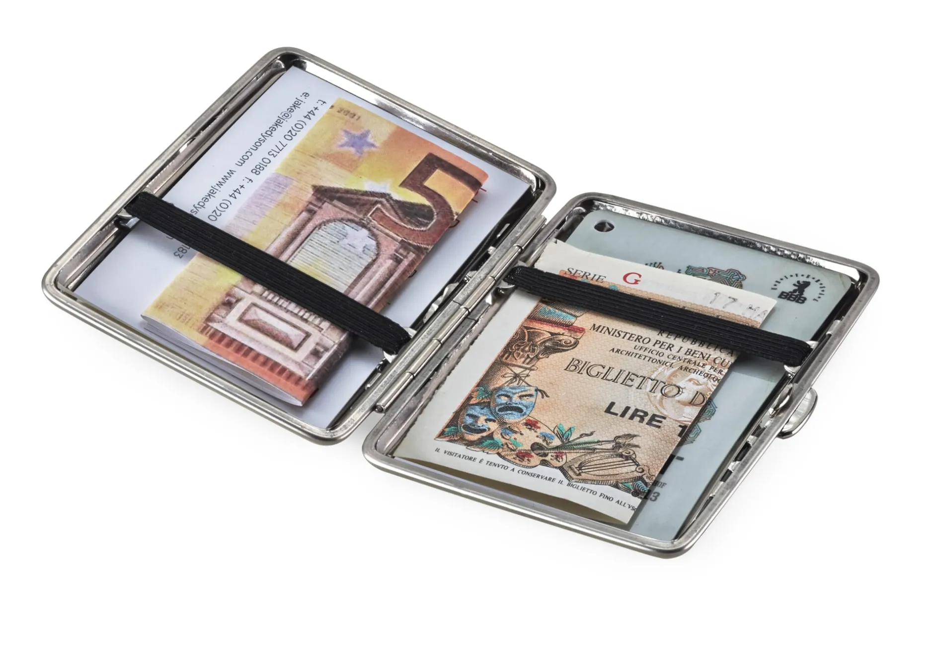 Passend für Karten bis zu einem Format von 86 × 54 mm. Aus vernickeltem Bandstahl. Mit jeweils einem Gummiband im Inneren von Boden und Deckel. Hergestellt in Deutschland. Lieferung ohne Inhalt. Breite 9,5 cm, Tiefe 7 cm, Höhe 1,8 cm. Gewicht 70 g.