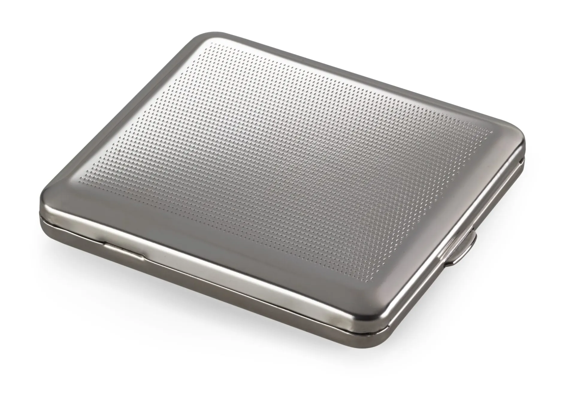 Aus vernickeltem Bandstahl. Mit jeweils einem Gummiband im Inneren von Boden und Deckel. Hergestellt in Deutschland. Lieferung ohne Inhalt. Breite 9,2 cm, Tiefe 8,2 cm, Höhe 1,6 cm. Gewicht 74 g.