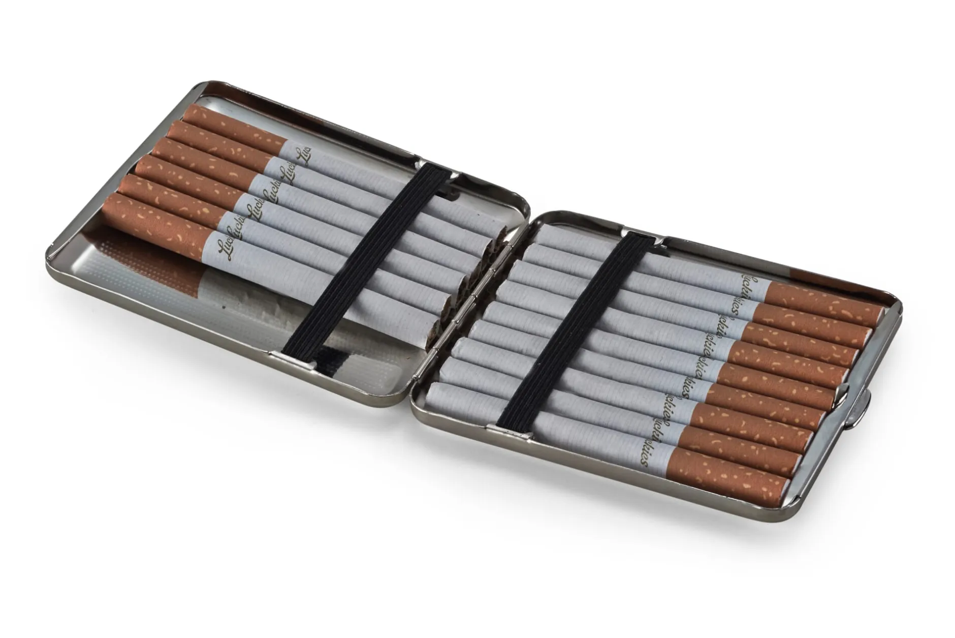 Von jeweils einem Gummiband gehalten, lassen sich in dem Zigarettenetui 18 Filterzigaretten oder auch die auf Vorrat produzierten Selbstgedrehten knitterfrei und stoßsicher unterbringen.