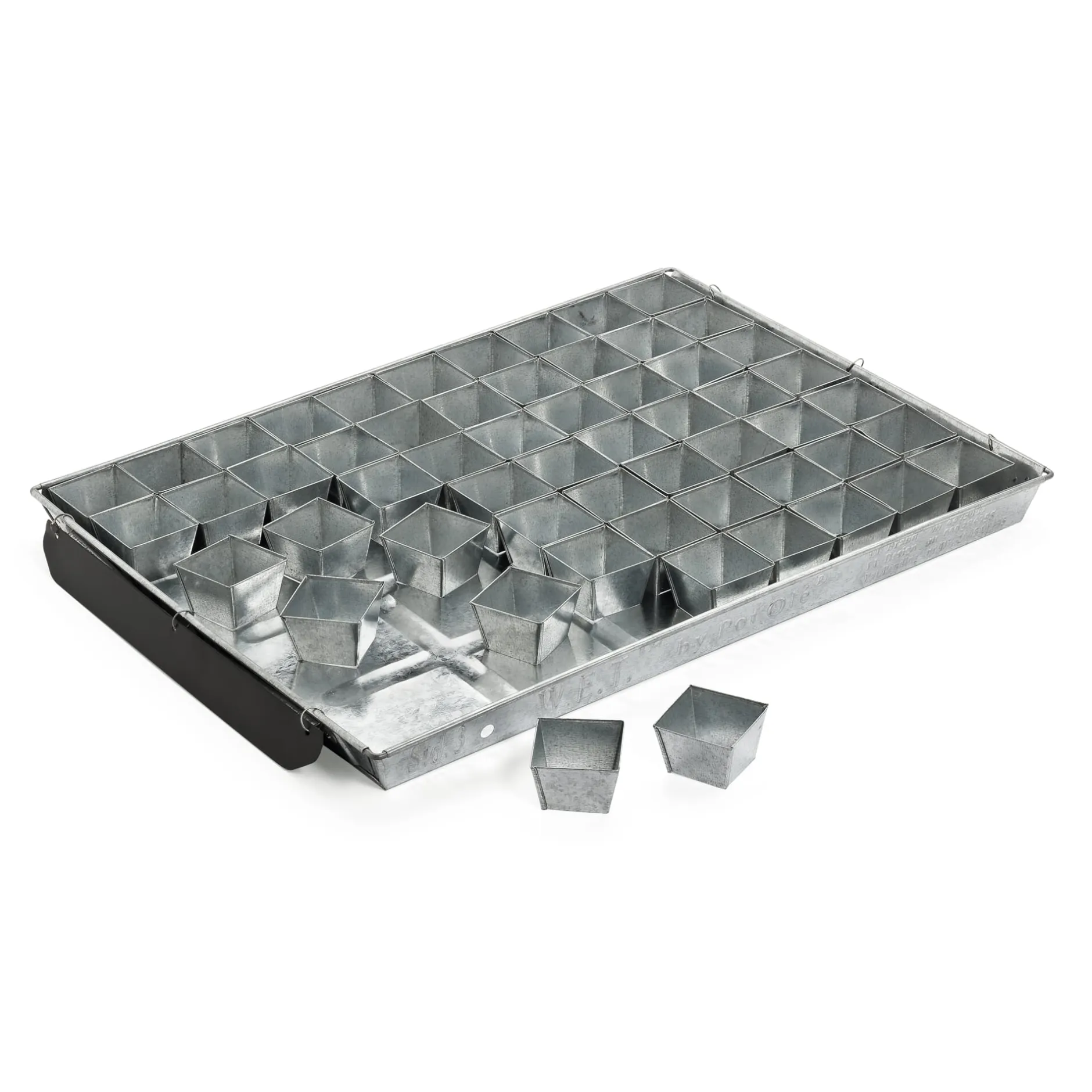 Bei der Jungpflanzen-Anzucht leistet es gute Dienste: Dieses „Tablett“ mit erhöhtem Rand kann je nach Ausführung bis zu 70 kleine Rahmen aus Stahl (Einzeltöpfe ohne Boden) aufnehmen. Es wird mit Erde befüllt, damit direkt hineingesät werden kann. Stecklinge oder vereinzelte Jungpflanzen lassen sich ebenfalls einsetzen. Da die Rahmen nur lose auf der Platte stehen, können sie jederzeit leicht entnommen werden, ohne dass dabei die empfindlichen Wurzelballen beschädigt würden; die konische Form erleichtert das Herausdrücken der Ballen im Ganzen – und somit auch das Umpflanzen in Beet oder Topf.