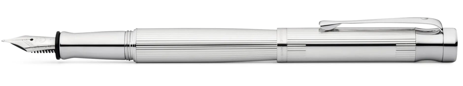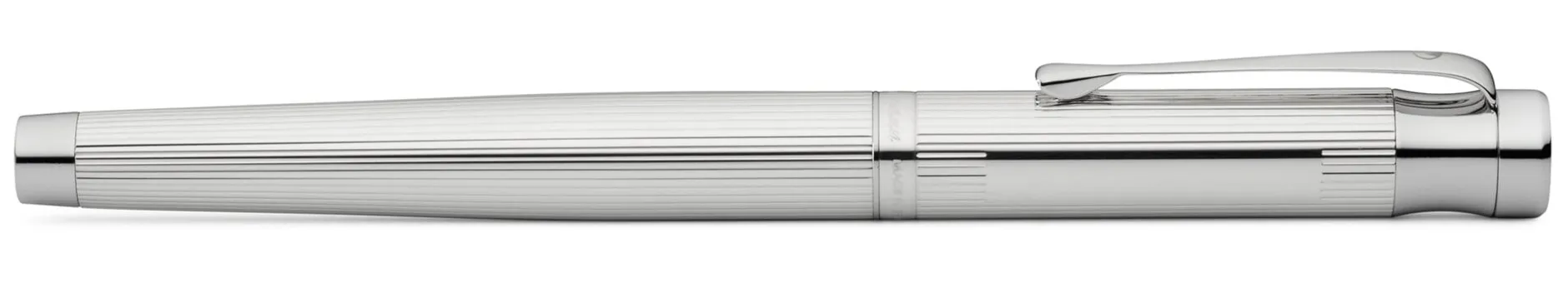 Korpus 925er Silber massiv mit feiner Korn- bzw. Linienguilloche und glänzend poliertem Gravurfeld (30 x 5 mm). Schraubbare Kappe zum Verschließen und Verlängern, Kappengewinde Kunststoff. Clip Stahl vernickelt, rhodiniert. Feder Edelstahl, poliert, mit Iridiumkorn. Länge geschlossen 13,5 cm, schreibfertig 12 cm. Gewicht 40 g. Federbreiten F, M und B (bitte bei der Bestellung angeben). Lieferung mit 6 Standardpatronen in Blau, Konverter und Silberputztuch.