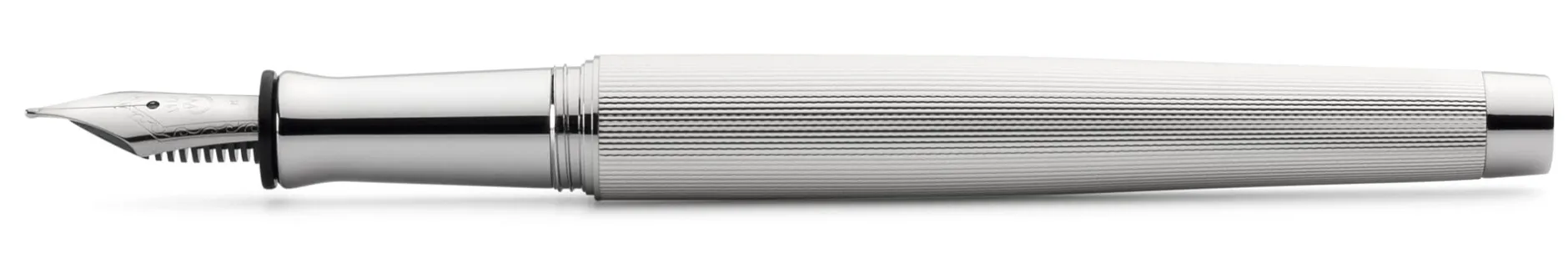 Korpus 925er Silber massiv mit feiner Korn- bzw. Linienguilloche und glänzend poliertem Gravurfeld (30 x 5 mm). Schraubbare Kappe zum Verschließen und Verlängern, Kappengewinde Kunststoff. Clip Stahl vernickelt, rhodiniert. Feder Edelstahl, poliert, mit Iridiumkorn. Länge geschlossen 13,5 cm, schreibfertig 12 cm. Gewicht 40 g. Federbreiten F, M und B (bitte bei der Bestellung angeben). Lieferung mit 6 Standardpatronen in Blau, Konverter und Silberputztuch.