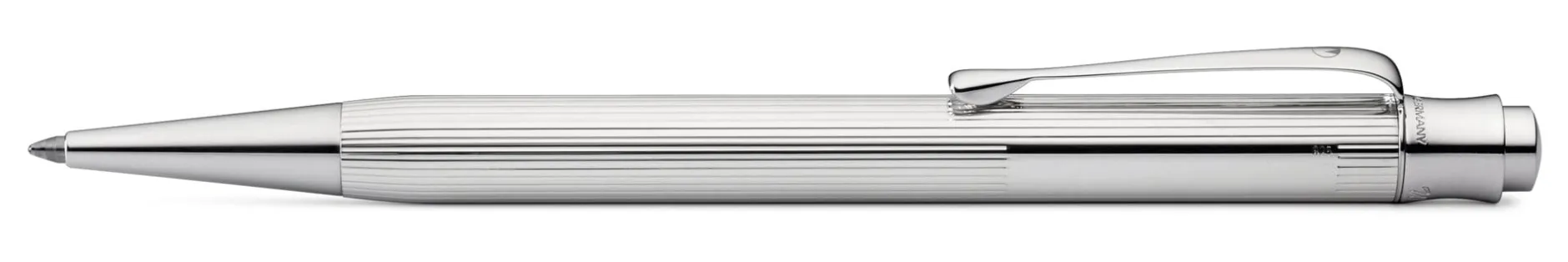 Korpus 925er Silber massiv mit feiner Korn- bzw. Linienguilloche und glänzendpoliertem Gravurfeld (30 × 5 mm). Clip Stahl vernickelt, rhodiniert. Druckmechanik mit Großraummine. Hergestellt in Deutschland.