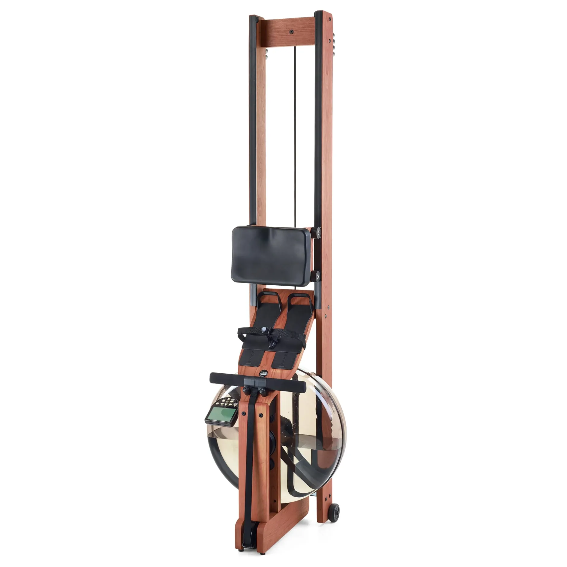 Rahmen und gepolsterter, auf vier Leichtlauf-Rollen gelagerter Rollsitz aus geöltem Hartholz. Wassertank aus bruchfestem Polycarbonat. Die mechanisch beanspruchten Teile (kugelgelagerte Rollen, Laufflächen, Zugbänder) sind sämtlich verschleißfest und wartungsfrei, sie versehen ihren Dienst reibungsarm und nahezu geräuschlos (zu hören ist lediglich das moderate Rauschen des Wassers, mit dem jeder Zug quittiert wird). Um die Trainingsleistung anzeigen und auswerten zu können (eine für die Dosierung und Optimierung des Trainings sinnvolle Option), ist das Gerät mit einem batteriebetriebenen, PC-kompatiblen Leistungsmonitor ausgerüstet. Er dokumentiert Trainingszeit, Schlagzahl, Geschwindigkeit und die zurückgelegte Distanz sowie die erbrachte Leistung (in Watt) und verfügt zudem über verschiedene Programmierfunktionen zur Gestaltung und Kontrolle des Trainings (z.B. für das Intervall-Training).