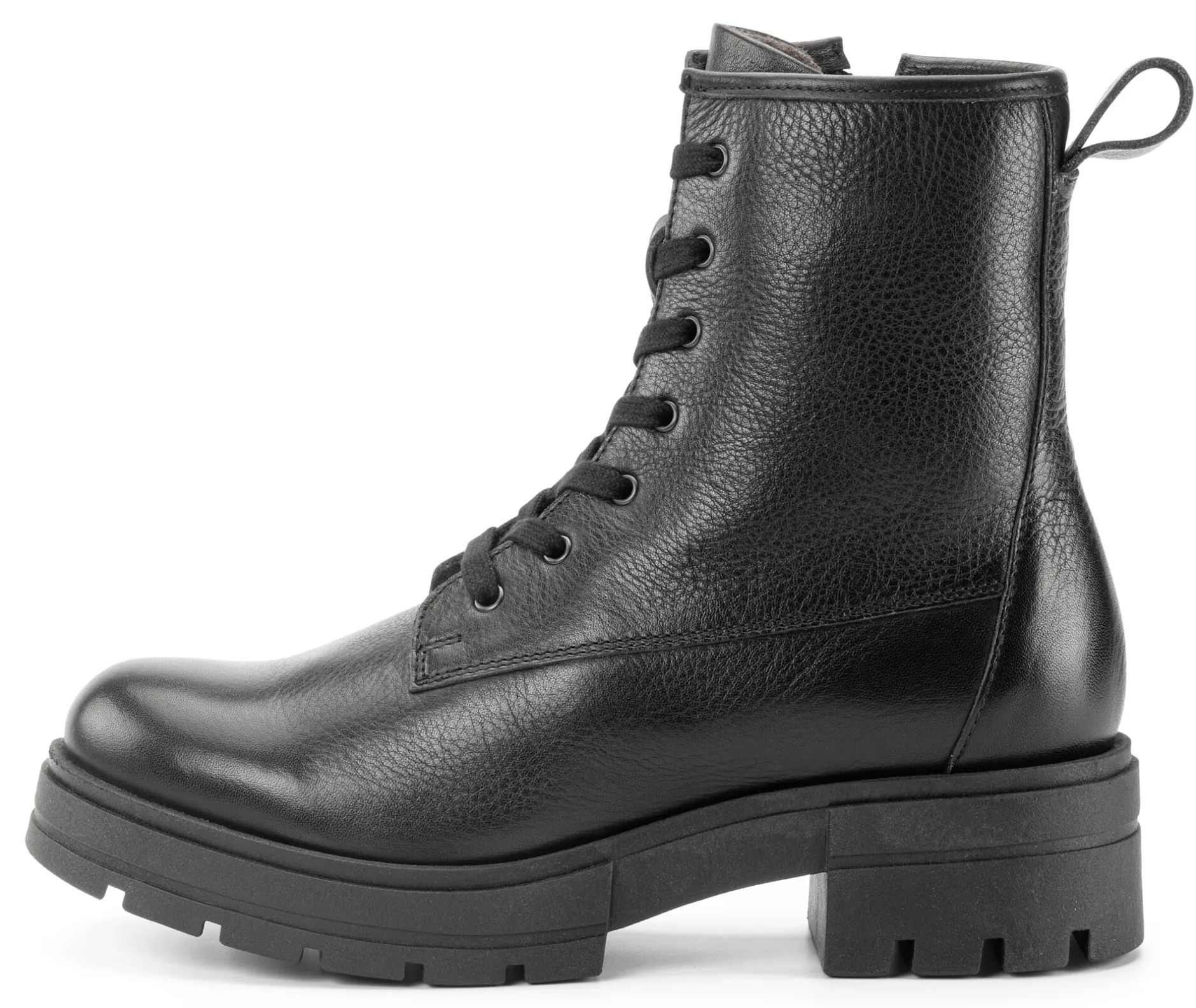 Dieser überknöchelhohe Schnürstiefel kombiniert ein markant genarbtes, vegetabil gegerbtes Rindleder mit einem wärmenden Lodenfutter aus reiner Wolle. Die starke, leicht profilierte Gummisohle sorgt zusätzlich dafür, Kälte von unten abzuhalten. Der Schuh wird geschnürt, ein seitlich eingesetzter Reißverschluss erlaubt jedoch ein schnelles und komfortables An- und Ausziehen.