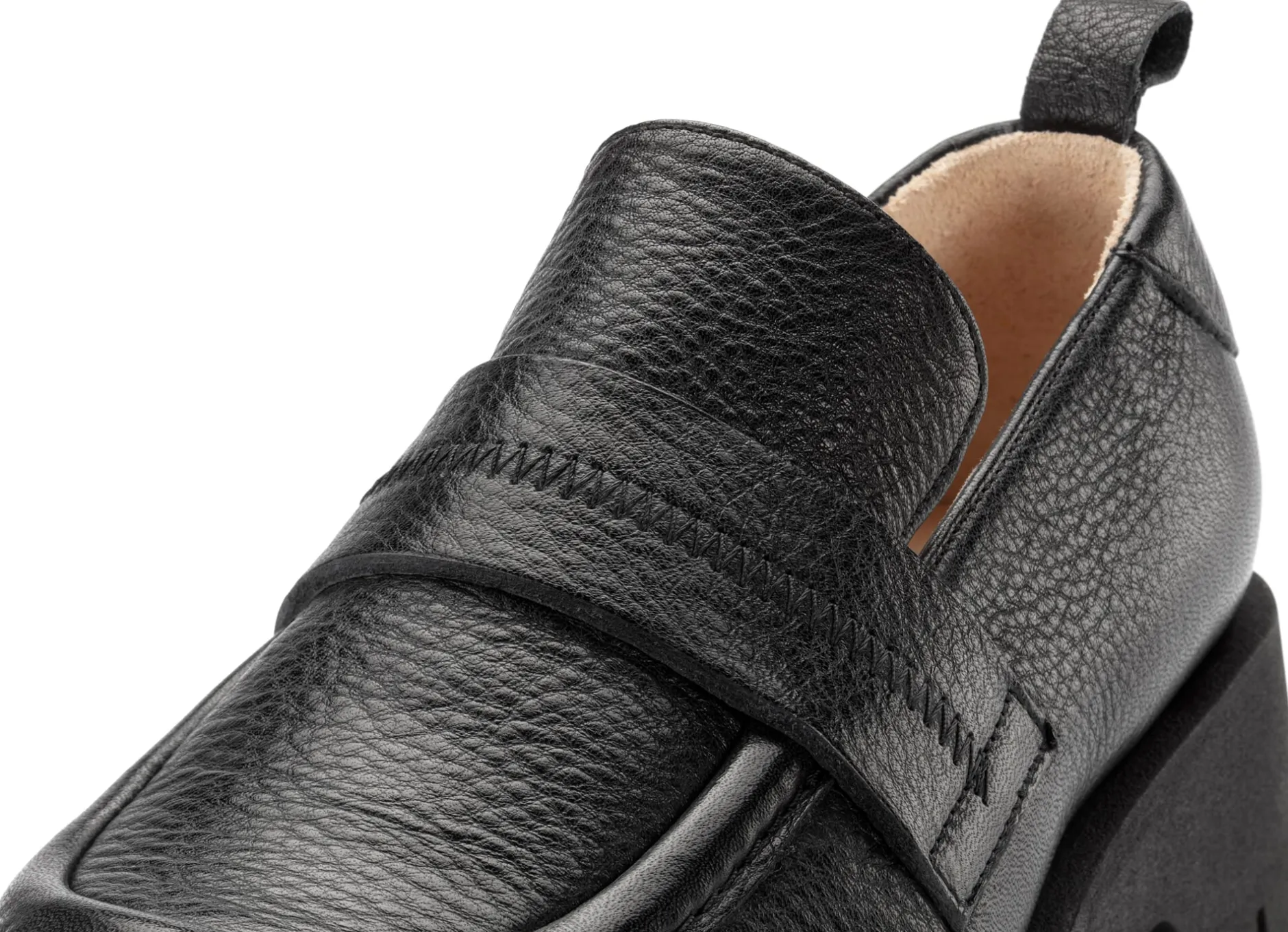 Loafer gibt es schon sehr lange. Die ersten Modelle waren quasi Mokassins mit fester Sohle, später kam der Absatz hinzu. In den 1940er und 1950er Jahren avancierte der Loafer zum Lieblingsschuh der Student*innen an den amerikanischen Ostküsten-Universitäten, was ihm auch den Namen College-Schuh eintrug. Seine Popularität ist bis heute ungebrochen – und das völlig zu Recht, denn Loafer passen zu den unterschiedlichsten Stilen. Werner fertig diesen Loafer aus weichem Wernebi Nappaleder in klassischem Schwarz. Er ist innen komplett mit vegetabil gegerbtem Leder gefüttert und mit einer gepolsterten Decksohle ausgestattet, die bequemes Gehen und Stehen selbst über Stunden ermöglicht. Sie kann aber auch herausgenommen und durch eigene Einlagen ersetzt werden. Ins Auge springt die besonders stark ausgeführte Laufsohle aus thermoplastischem Gummi. Sie setzt nicht nur einen markanten optischen Akzent, sondern sorgt auch für gute Trittdämpfung und isoliert gegen Bodenkälte.