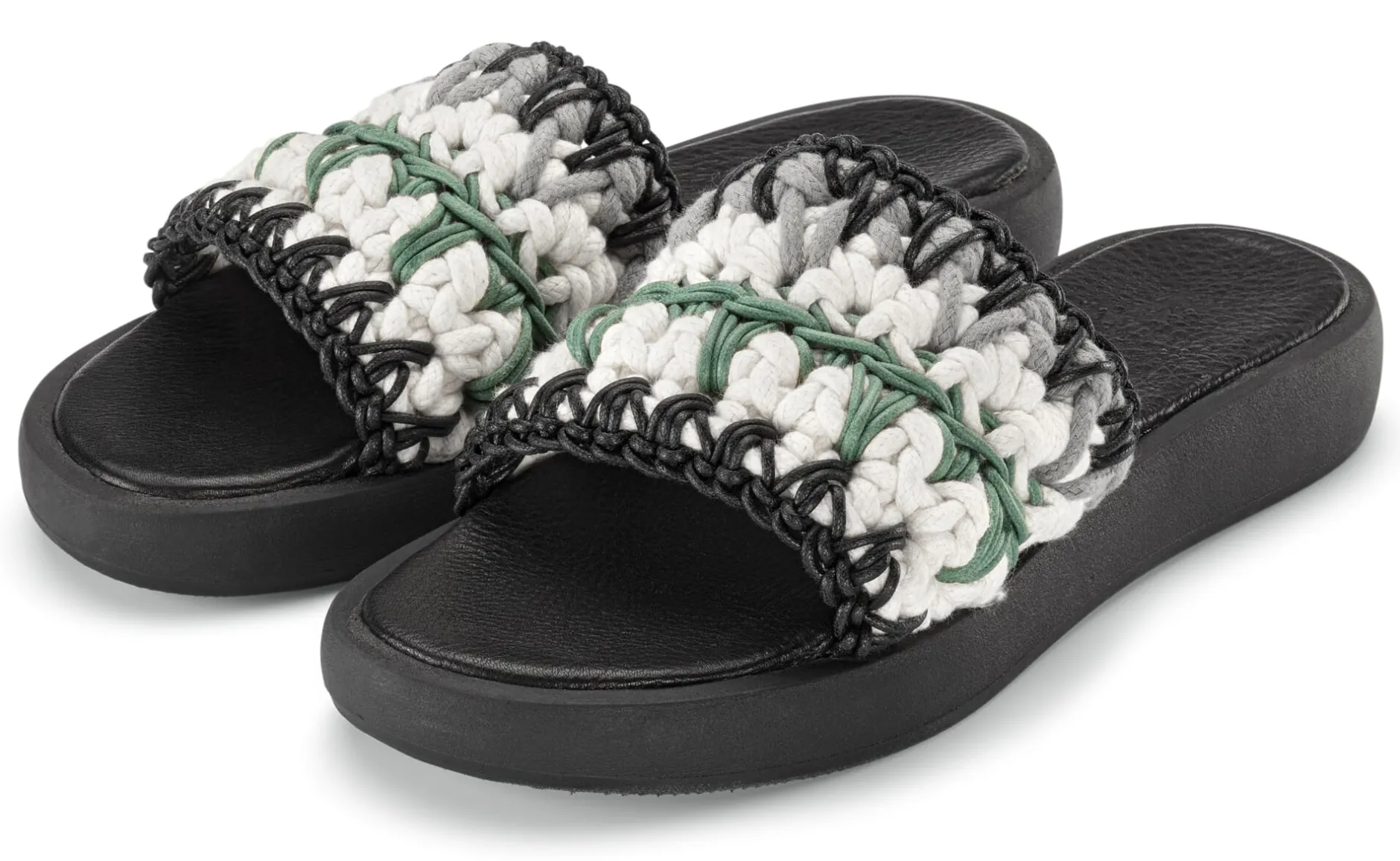 Die Besonderheit dieser Pantolette ist das Band, das um den Fußrücken geführt wird: Es ist aus italienischen Schnürsenkeln gehäkelt, die aus reiner, hautsympathischer Baumwolle bestehen. Durch das Maschenwerk ist es einerseits luftig und andererseits passt es sich perfekt der individuellen Fußform an. Die starke, leicht geriffelte Sohle aus thermoplastischem Gummi bietet nicht nur Grip auf vielen Untergründen, sie wirkt auch trittdämpfend, was die Pantolette in Verbindung mit der gepolsterten Lederdecksohle sehr bequem macht.