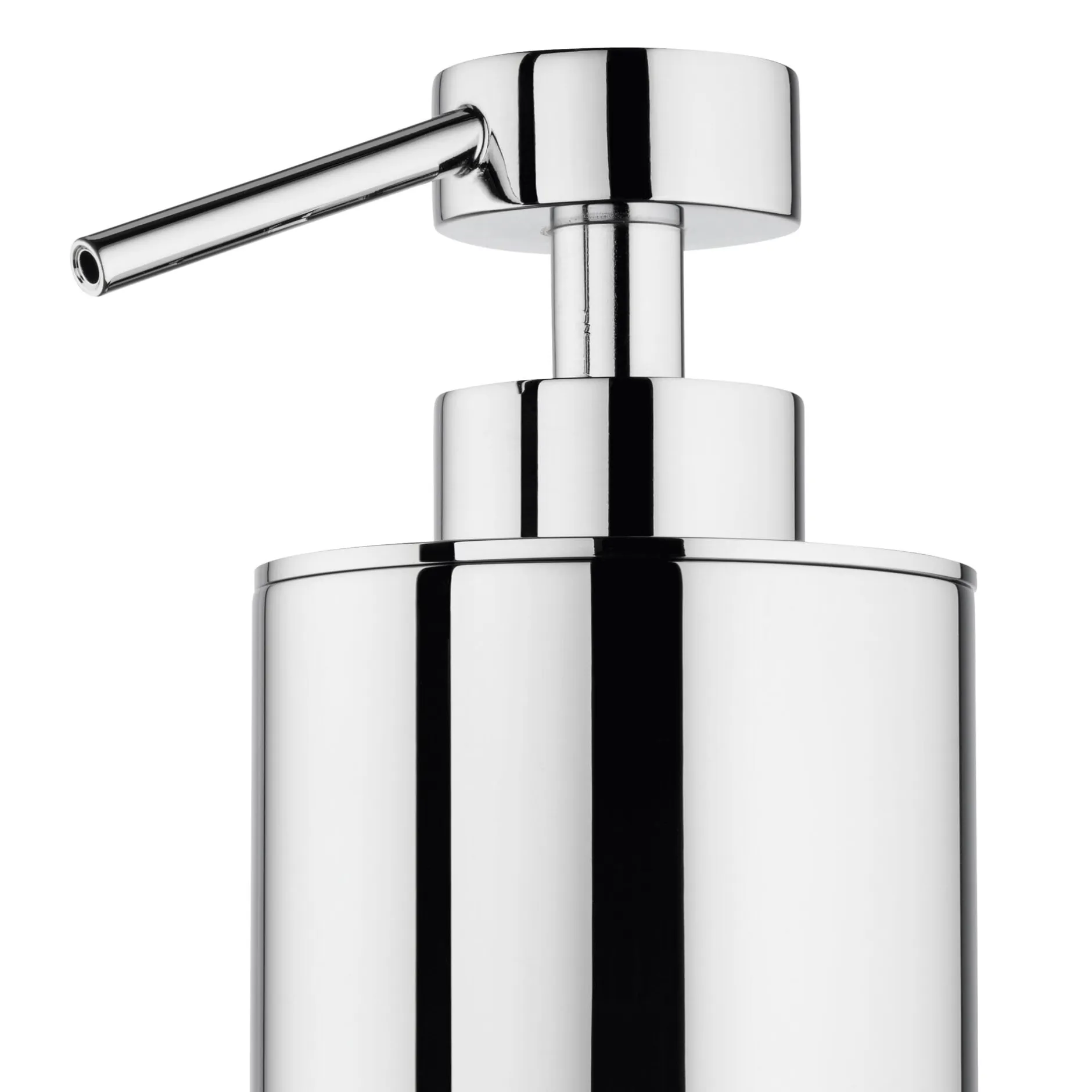 Seifenspender und Pumpe aus verchromtem Messing. Seifentank aus Pressglas, klar. Saugschlauch aus Kunststoff. Volumen 140 ml. Höhe 16 cm, Ø 6 cm. Gewicht 590 g. Lieferung ohne Seife.