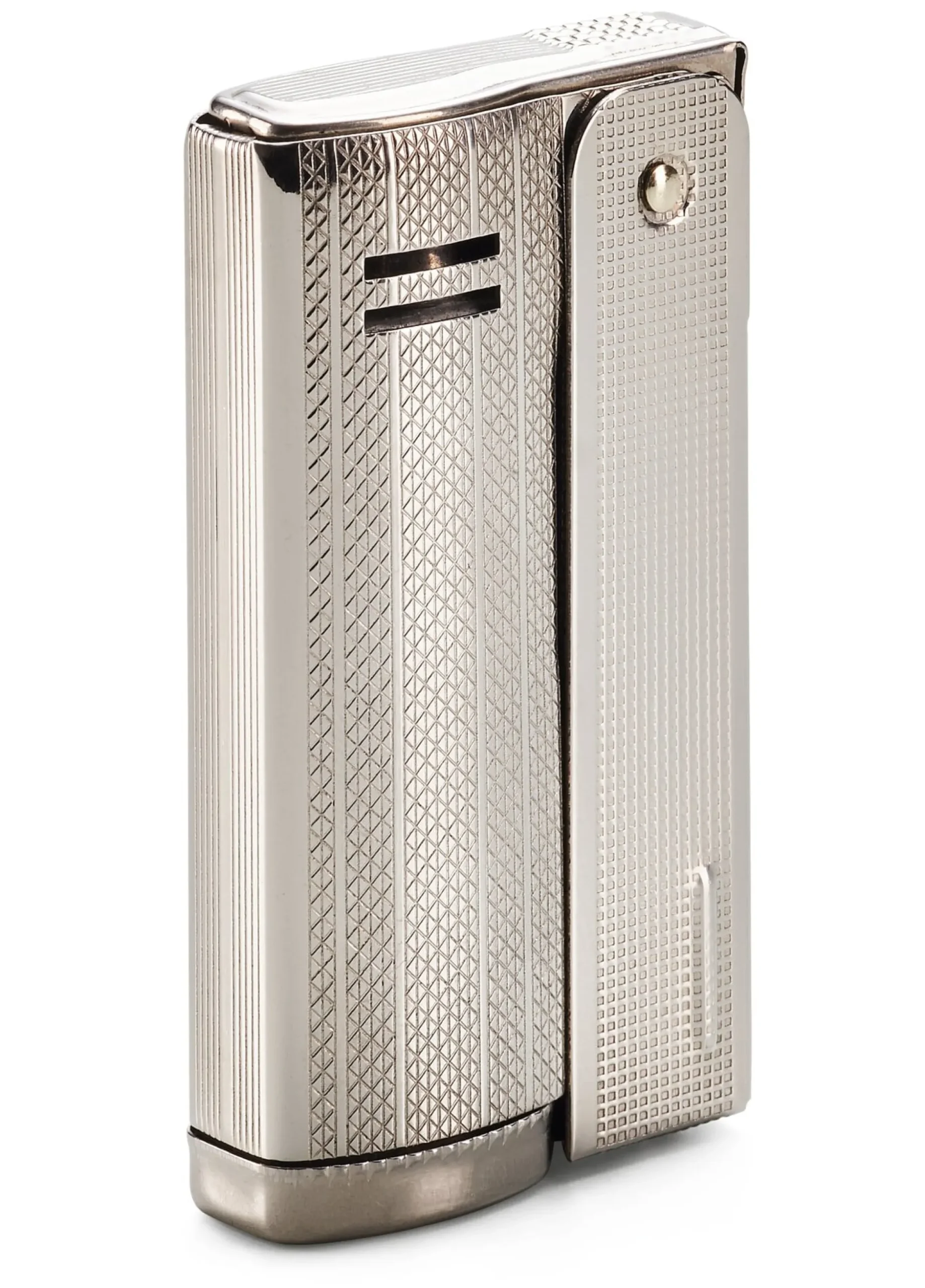 Stahl, vernickelt. Länge 3,2 cm, Breite 1,3 cm, Höhe 5,8 cm. Gewicht 38 g. Lieferung in einer Geschenkbox.