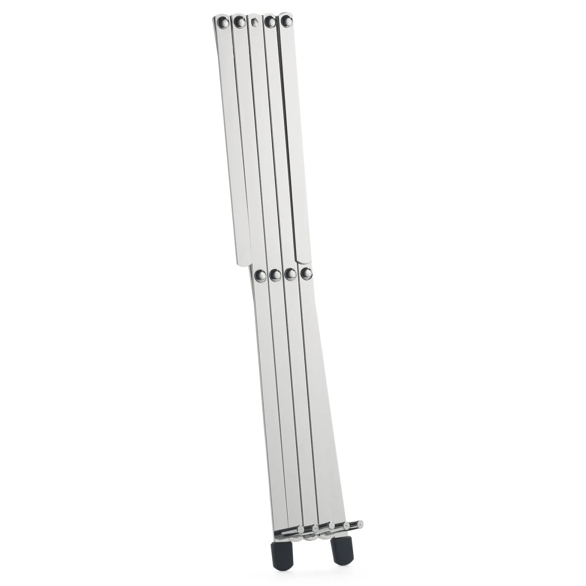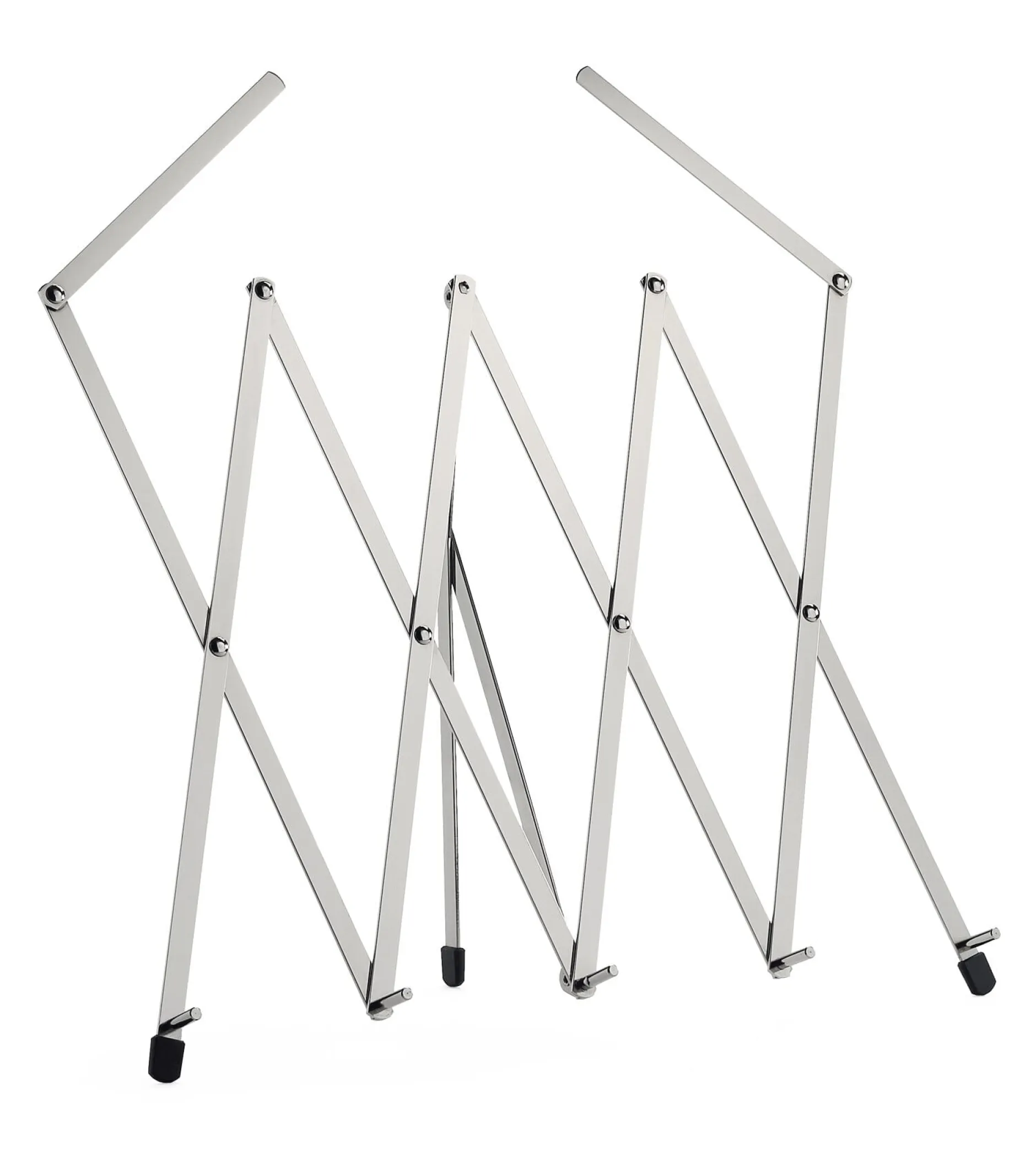 Stahl vernickelt. Kunststoffüße. Höhe 26 cm, Breite 4–90,5 cm, Tiefe 4 cm. Gewicht 250 g. Lieferung ohne Demonstrationsobjekte.