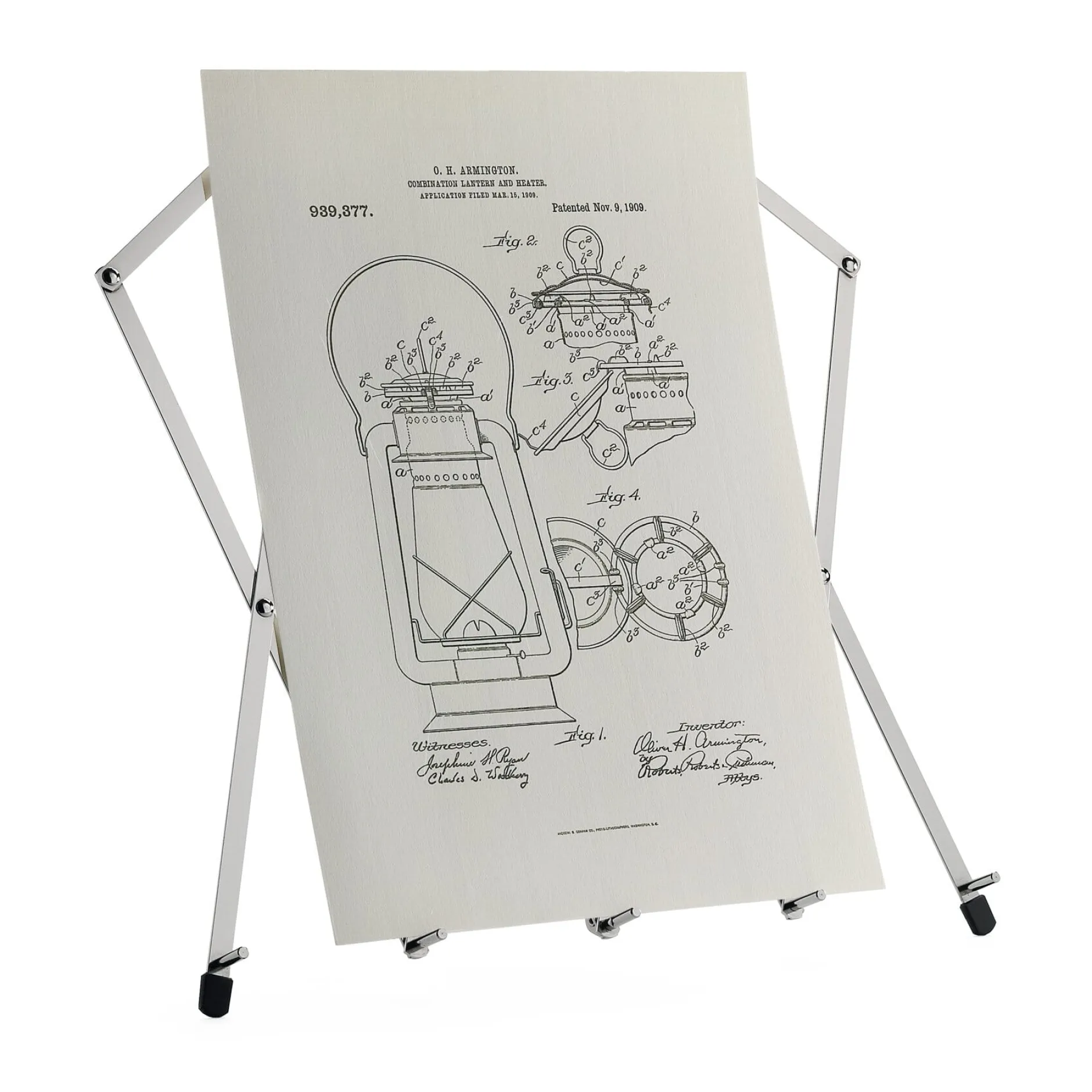 Angesichts des trivialen Zwecks, den sie zu erfüllen haben, kommen marktübliche Konzepthalter recht klobig daher und sind überdies häufig auf A4-Formate beschränkt. Die variable, faltbare, preisgünstige (und ansehnliche) Alternative kommt aus Süddeutschland. Das Scherenpult präsentiert neben A4-Hoch- und -Querformaten aufgeschlagene A4-Hefte und A3-Querformate.