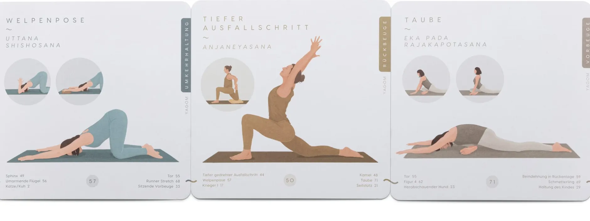Der Geist ist willig, der Körper auch: Mit voller Motivation möchten Sie in Ihre eigene Yogapraxis eintauchen. Nur: Welche Asanas in welcher Reihenfolge ausführen? Und worauf sollte man bei der Ausübung der einzelnen Positionen noch mal achten? Was im Yogakurs so einfach schien, ist zu Hause alles andere als offensichtlich. Was eignet sich zum Aufwärmen, wann kommen die Umkehrhaltungen, welche Position stärkt besonders den Rücken oder öffnet die Hüften? Und wie um alles in der Welt bleibe ich dabei im Flow? Abhilfe schaffen diese Yogakarten. Die (angenehm schlichten, klaren) Illustrationen zeigen die Asanas und alternative Ausführungen, auf der Rückseite ist genau beschrieben, was sie bewirken und worauf dabei jeweils zu achten ist. Was uns besonders gut gefällt, sind zum einen die registerähnlichen Kategorien – Aufwärmen, Drehung, Seit-, Rück- und Vorbeuge, Streckung und Umkehrhaltung –, die es einem leicht machen, die Yogahaltung einzuordnen. Zum anderen sind am unteren Rand links und rechts jeweils drei Asanas angegeben, die sich als vorangehende oder nachfolgende Position eignen. So können Sie selbst Asanas für Ihre Yogapraxis auswählen, sie in eine sinnvolle Abfolge bringen, dabei Schwerpunkte setzen und natürlich die Dauer bestimmen.