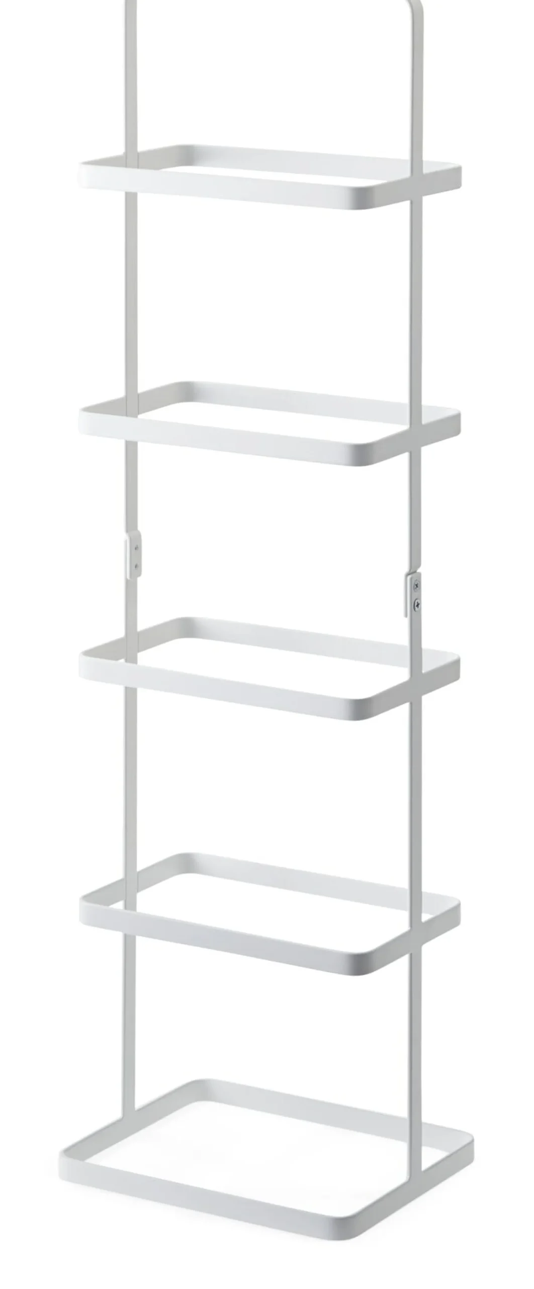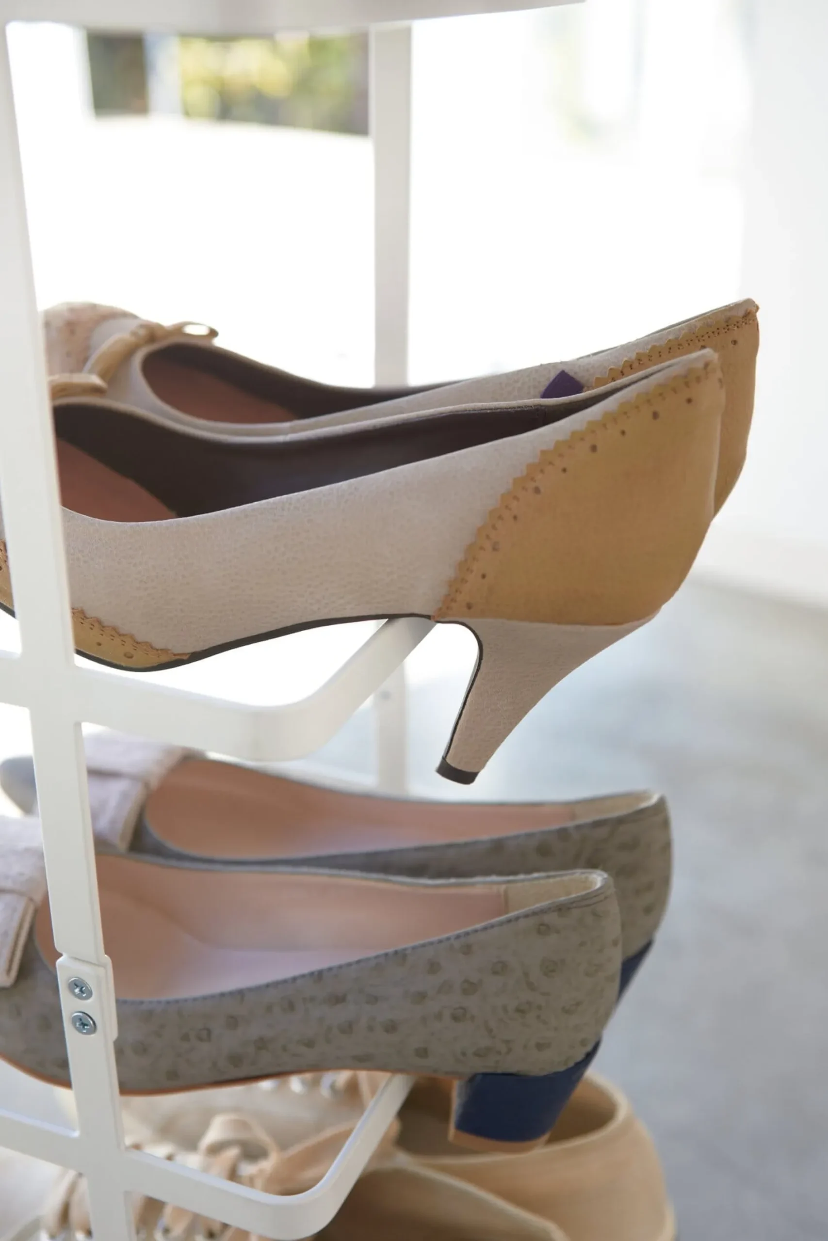 Standfest und minimal im Materialeinsatz: Das Schuhregal TOWER besteht aus einer filigranen Stahlstruktur und ist mobil, weil am oberen Bügel tragbar. In zwei verschiedenen Größen lieferbar.