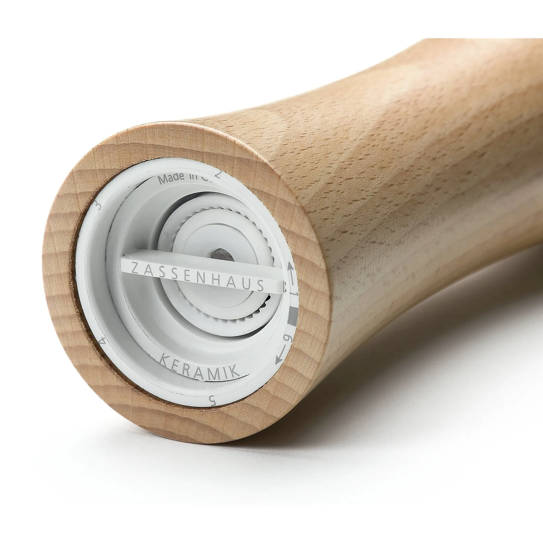 Das Mahlwerk aus deutscher Hochleistungskeramik wird bei 1.700 °C doppelt gebrannt, ist härter als Stahl sowie verschleißarm und korrosionsfrei. Kegel und Ring werden gemeinsam gebrannt, sodass sie absolut passgenau sind. Der Mahlgrad lässt sich über einen Steg am Boden stufenlos und präzise von 1 (pulverfein) bis 6 (grob gemörsert) einstellen. In zwei Schritten wird das Mahlgut zunächst im Grobzahnbereich vorgebrochen und erst dann im Feinzahnbereich fertig gemahlen. Der Einstellungsgrad – er lässt sich jederzeit auf der Skala ablesen – bleibt auch beim Nachfüllen immer exakt erhalten (die obere Schraube dient nur der Befüllung; ein Nachjustieren ist somit nicht nötig). Auch für Gewürze und Trockenkräuter.