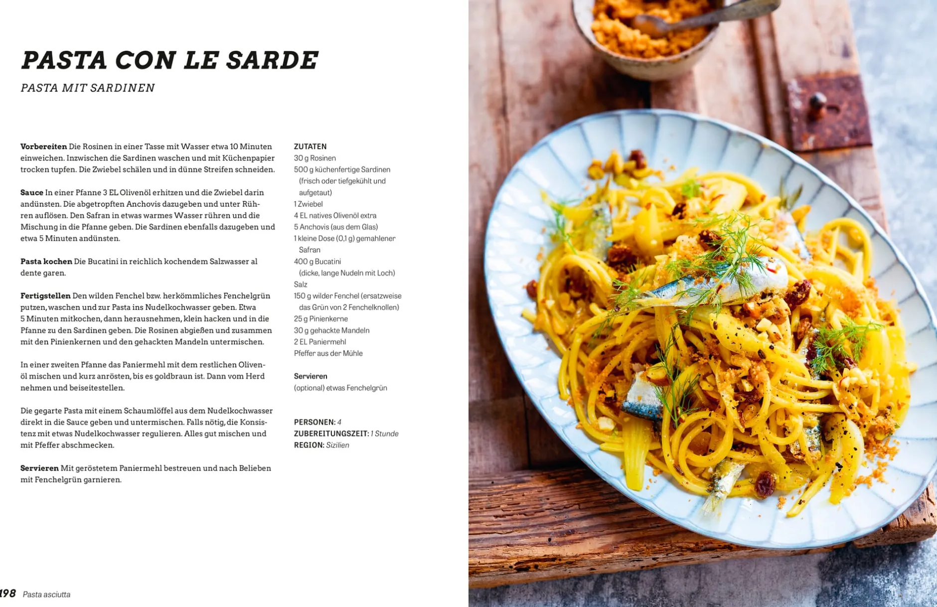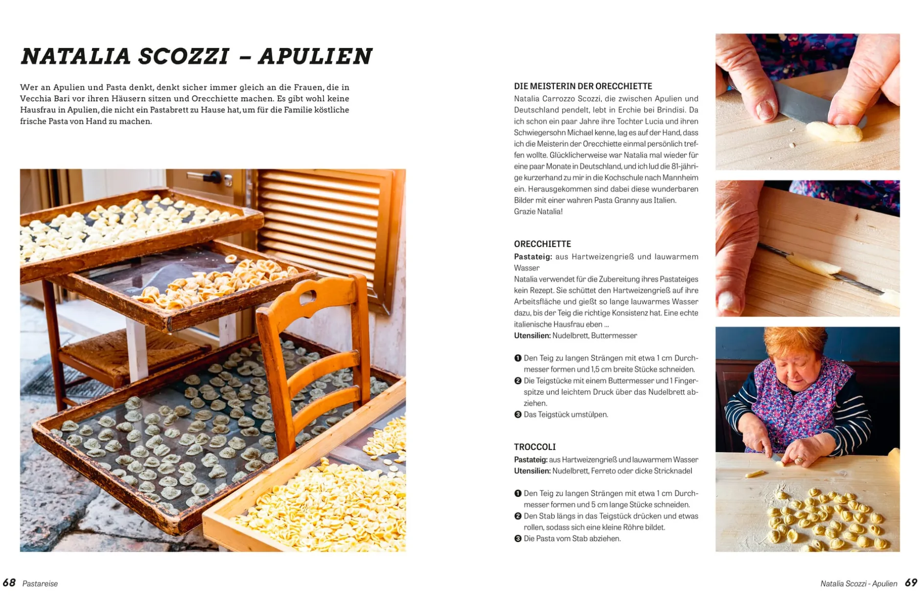Als contorni – Beilage – zu den Rezepten und praktischen Informationen in der Pasta-Schule serviert Domenico atmosphärische Reisefotos und spannende Geschichten rund um die Nudel: Er besucht Pasta-Feste und Nudel-Hotspots, z.B. das Tortellini Fest in Mantova, di Sagra delle Orecchiette in Bari und natürlich Gragnano, die Hauptstadt der Pasta. Er holt sich Tipps von Experten in Manufakturen und entlockt Hausfrauen ihre Geheimrezepte. Besser kann man Pasta nicht genießen!