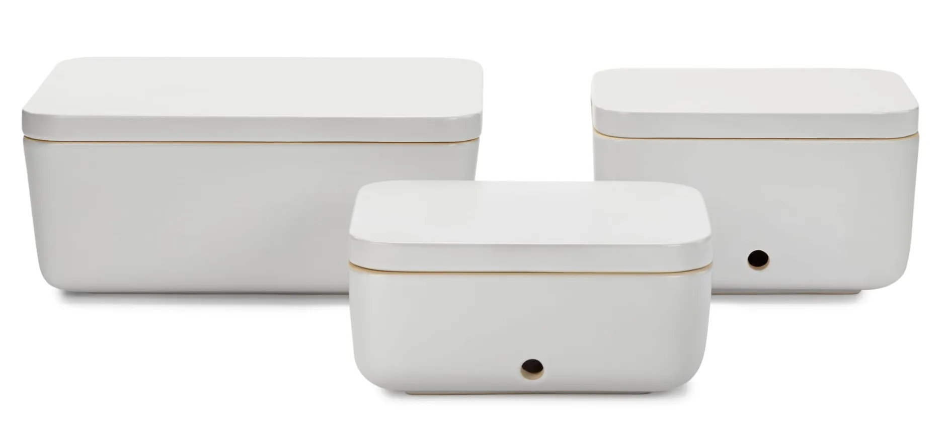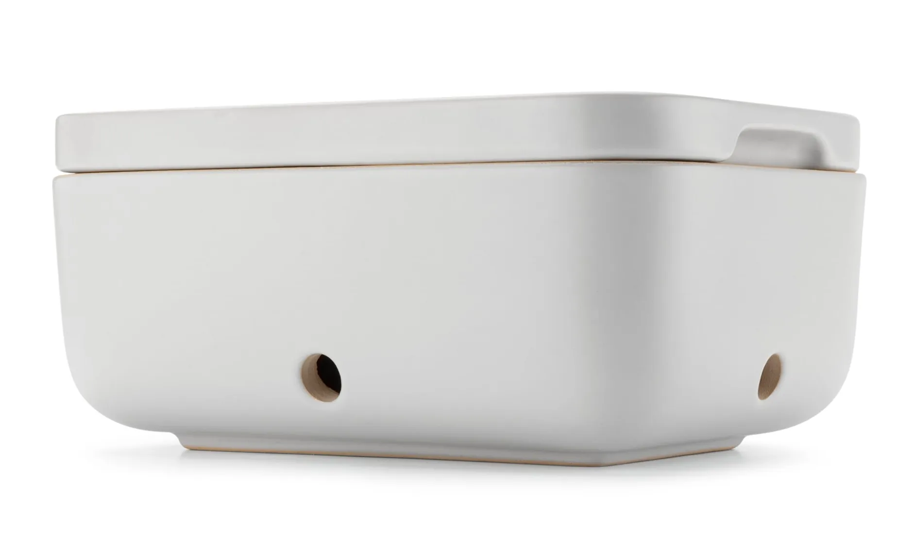 Kleiner formschöner Vorratskasten aus Keramik, einem idealen Material für ein Vorratsgefäß, wenn es so gearbeitet ist wie dieses: Die unglasierten rauen Innenflächen des Behälters speichern bis zu 10 Prozent der Luftfeuchtigkeit. Das sorgt im Zusammenspiel mit der Luftzufuhr durch Löcher an vier Seiten für ein verbessertes Klima für das Lagergut. Ideal geeignet für Zwiebeln – etwa 1 kg passt in den Behälter – oder anderes kleinformatiges Gemüse. Stapelbar.