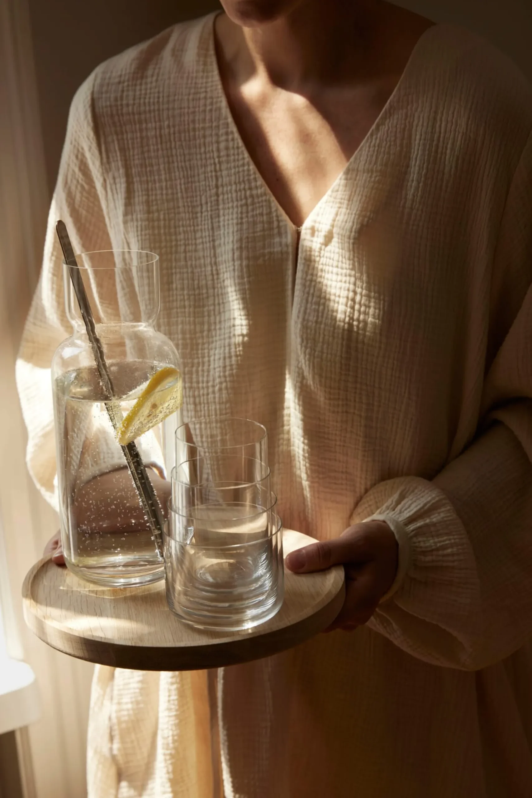 Feines Kristallglas in vier verschiedenen Größen und Formen im Set: Die Trinkgläser NESTING sind volumengleich, fügen sich als Stapel ineinander und lassen sich platzsparend verstauen. Für Wasser, Saft oder Cocktail. Spülmaschinengeeignet und in Form und Material ideal passend zur gleichnamigen Karaffe.