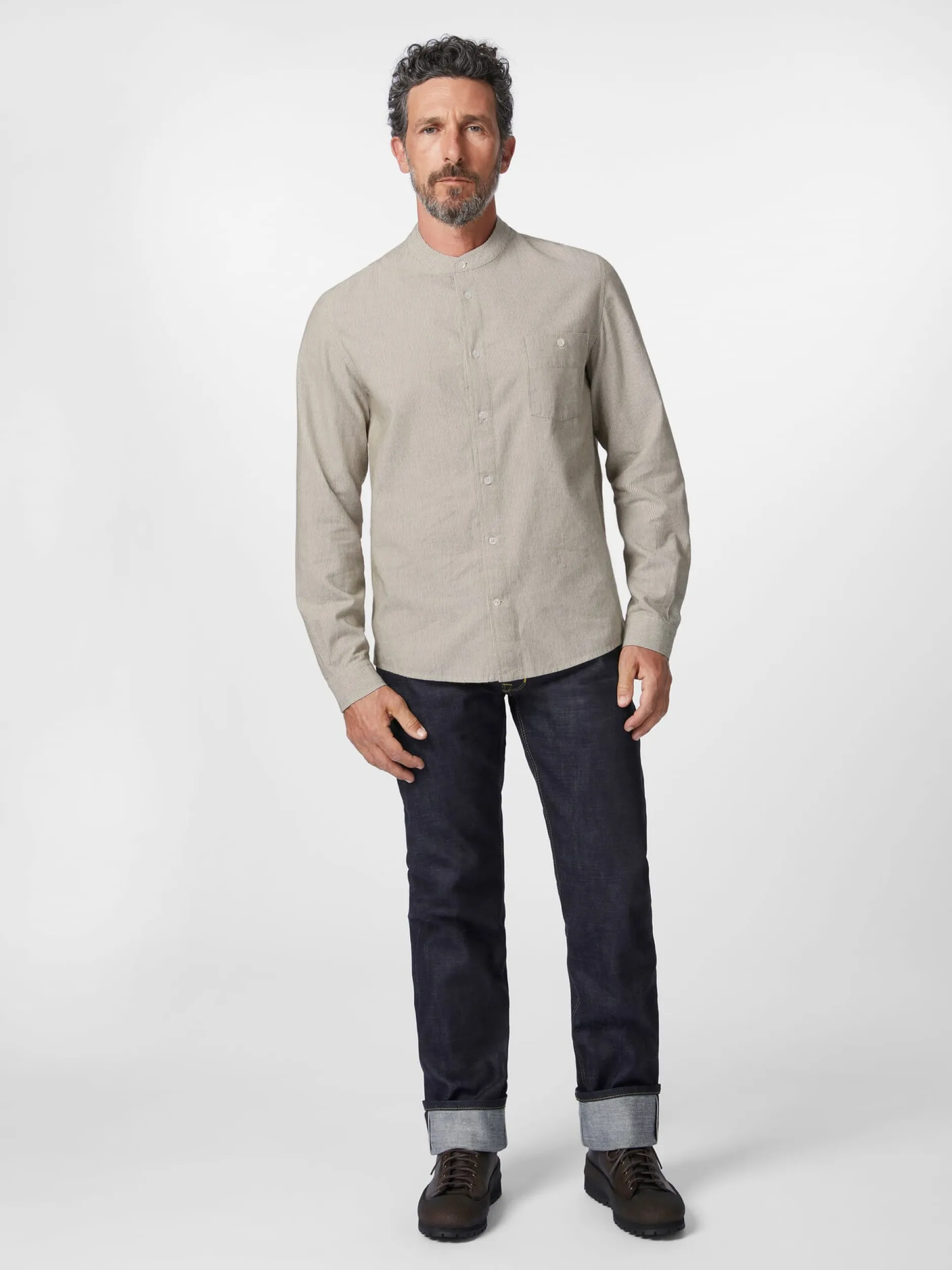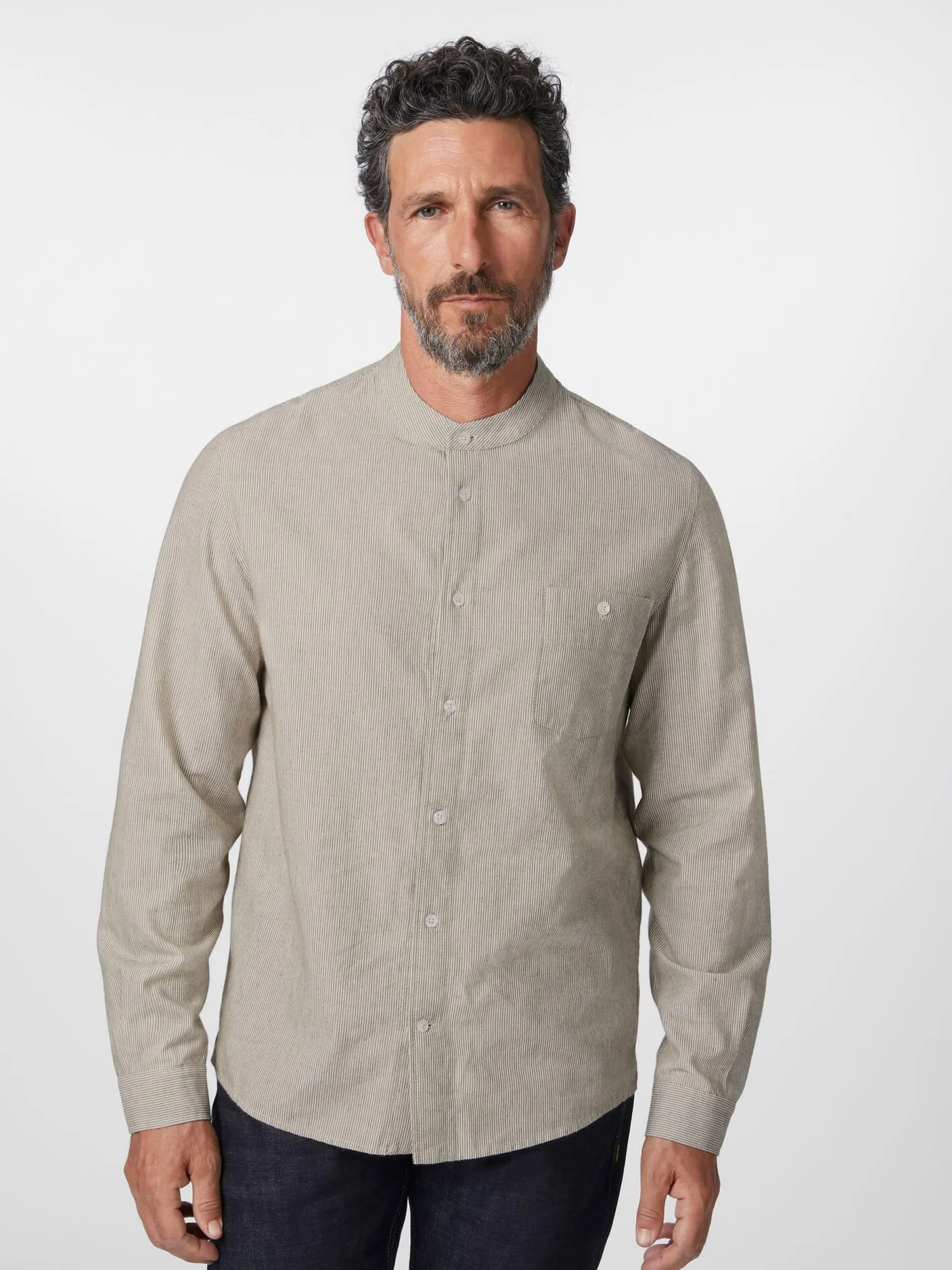 Der Stoff dieses Hemds zeigt ein feines Webstreifenmuster. Das Hemd ist mit einem schmalen Stehkragen gearbeitet und mit einer mustergetreu aufgesetzten, geknöpften Brusttasche ausgestattet. Gelegte Falten unter der Schulterpasse erhöhen den Tragekomfort. Die verwendete Baumwolle stammt aus kontrolliert biologischem Anbau.