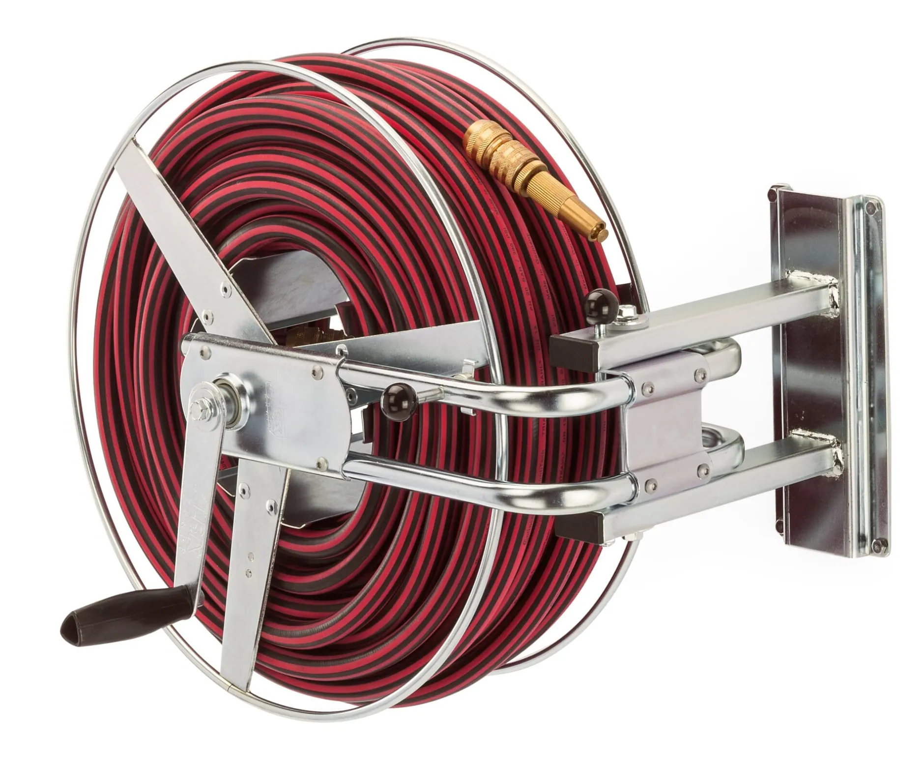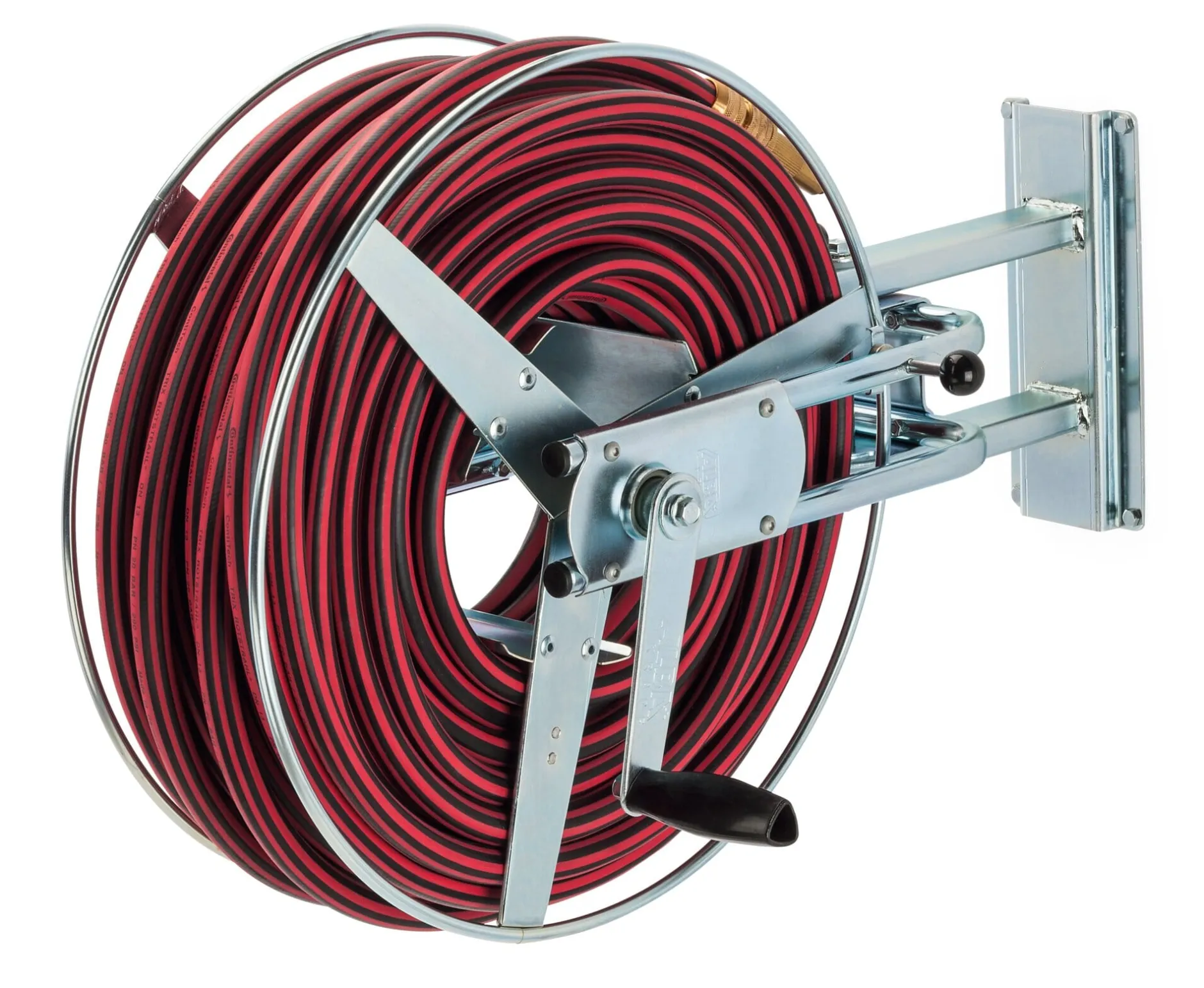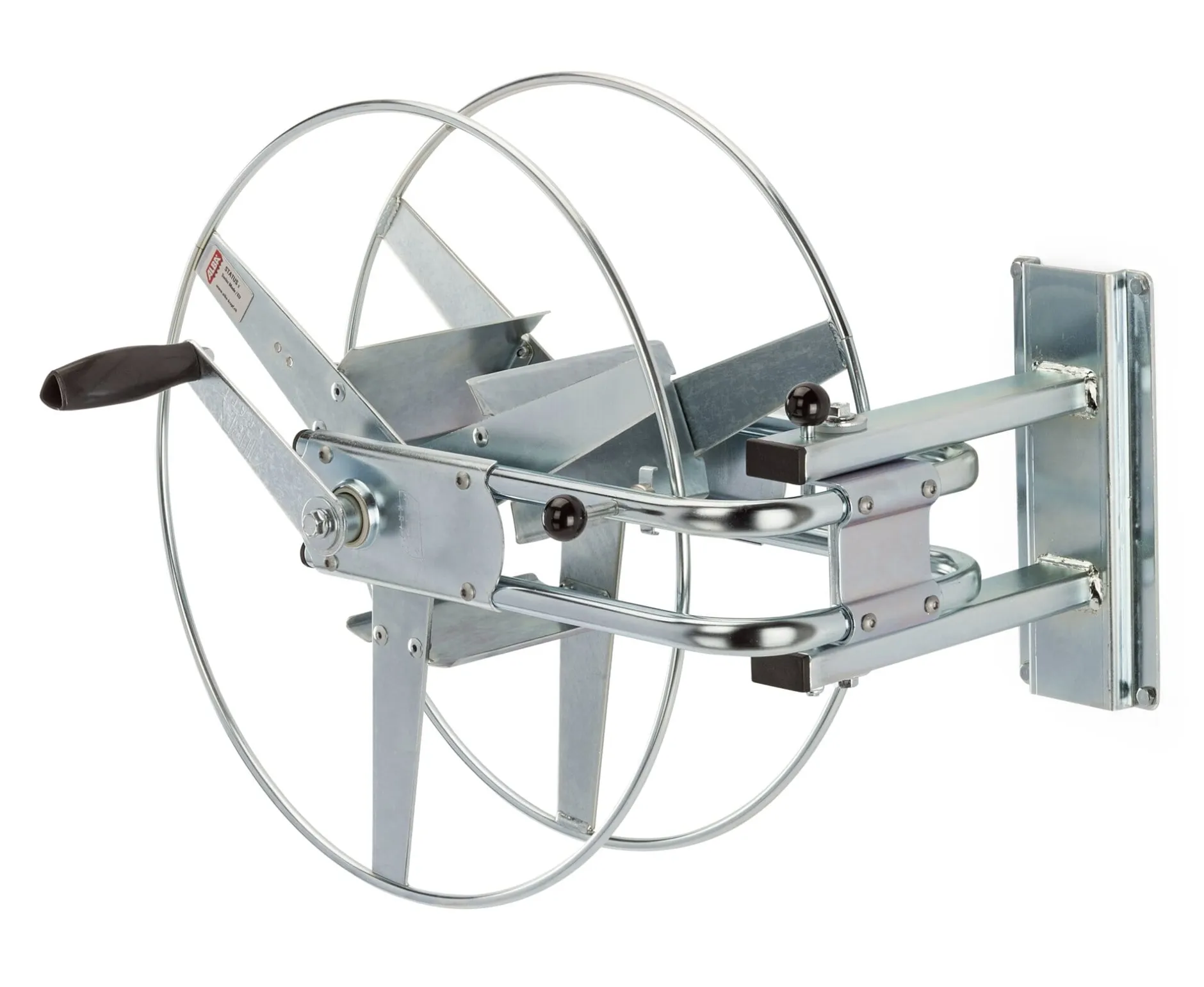 Diese stabile Schlauchhaspel ist komplett aus galvanisch verzinktem Stahl gefertigt. Sie kann max. 18 m eines 3/4″-Schlauches oder 50 m eines 1/2″-Schlauches aufnehmen. Die doppelt gelagerte Trommel wird fest an der Haus- oder Garagenwand montiert. Sie lässt sich schwenken und dabei noch, um das Ab- und Wiederaufwickeln des Gartenschlauchs zu erleichtern, auf sechs Stufen arretieren.