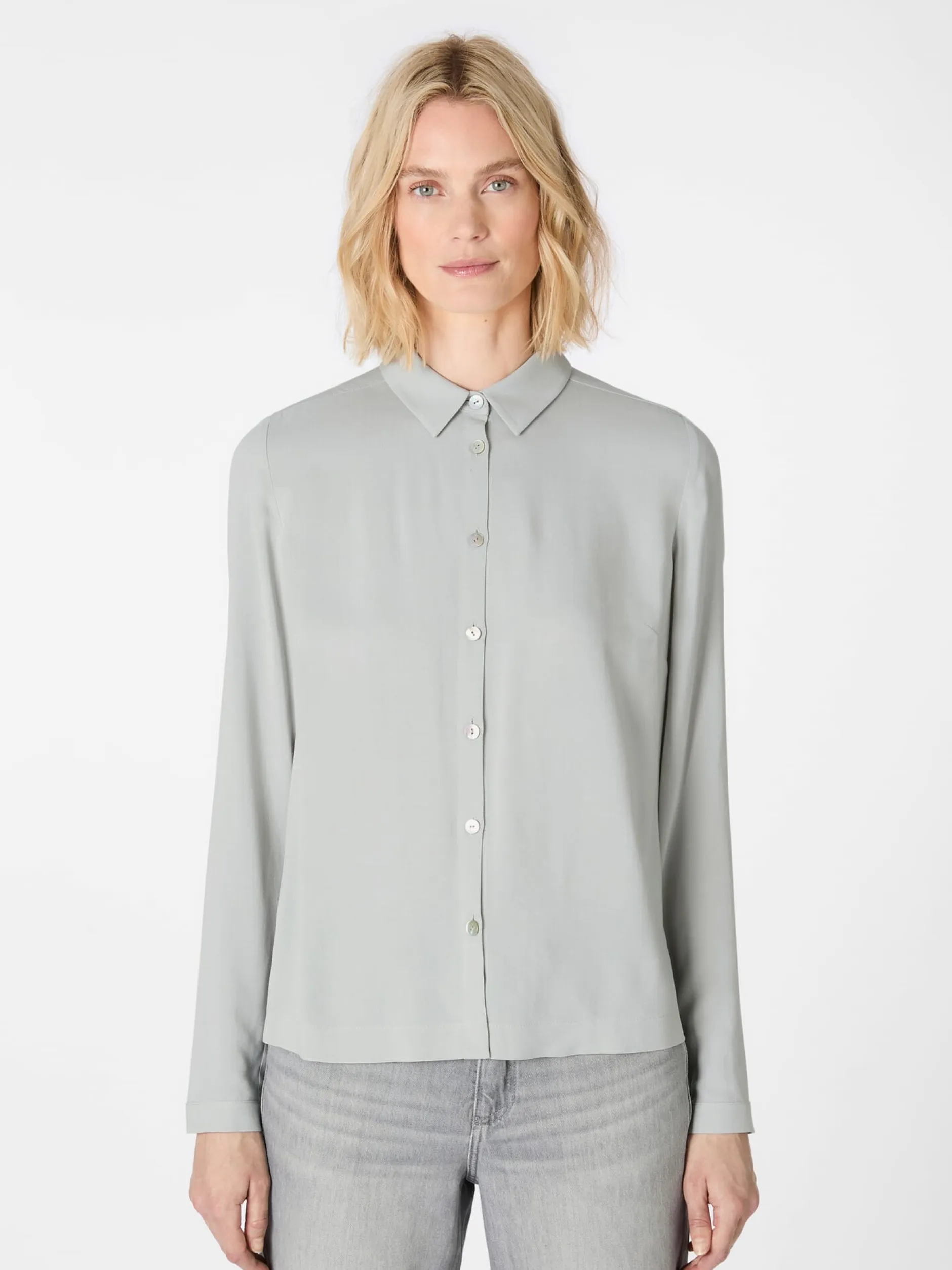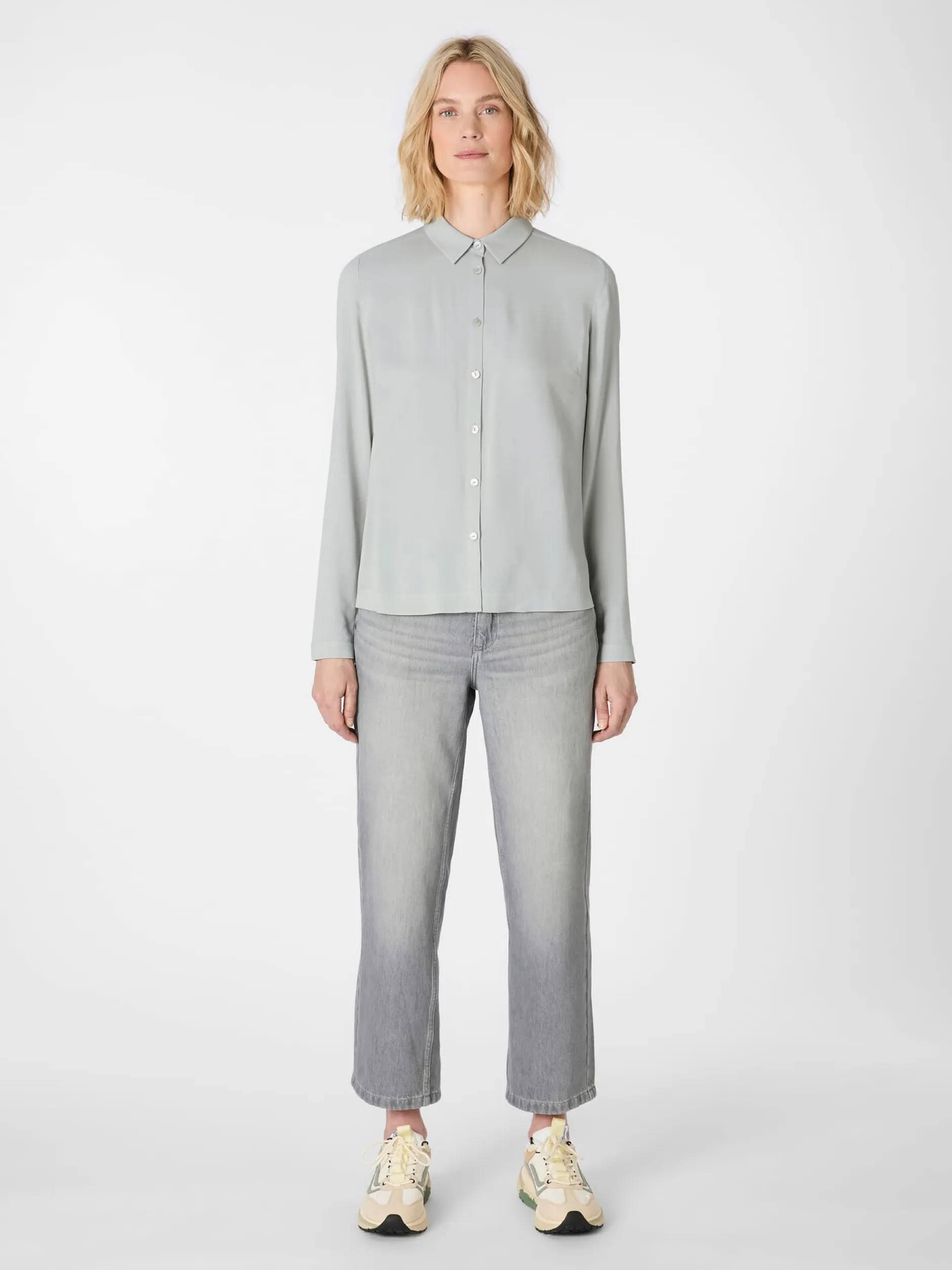 Das Gewebe dieser schlicht gehaltenen Bluse ist ein feiner Twill aus reiner Viskose, der sich durch ein schmiegsames Tragegefühl auszeichnet. Er ist hautsympathisch, hat eine seidig-weiche Textur und einen fließenden Fall, so dass er die Figur weich umspielt. Zudem ist der Stoff besonders atmungsaktiv, da Viskose viel Feuchtigkeit aufnehmen und schnell wieder nach außen abgibt. Gearbeitet ist die durchgeknöpfte Bluse mit Hemdkragen, geknöpften Ärmelabschlüssen und rundem Saum. Eine aufspringende Kellerfalte unter der Schulterpasse sorgt für einen guten Sitz und noch mehr Bewegungsfreiheit. Ob solo oder mit einem Pullunder getragen – die Bluse lässt sich vielseitig kombinieren, zu legeren wie zu eleganten Outfits.