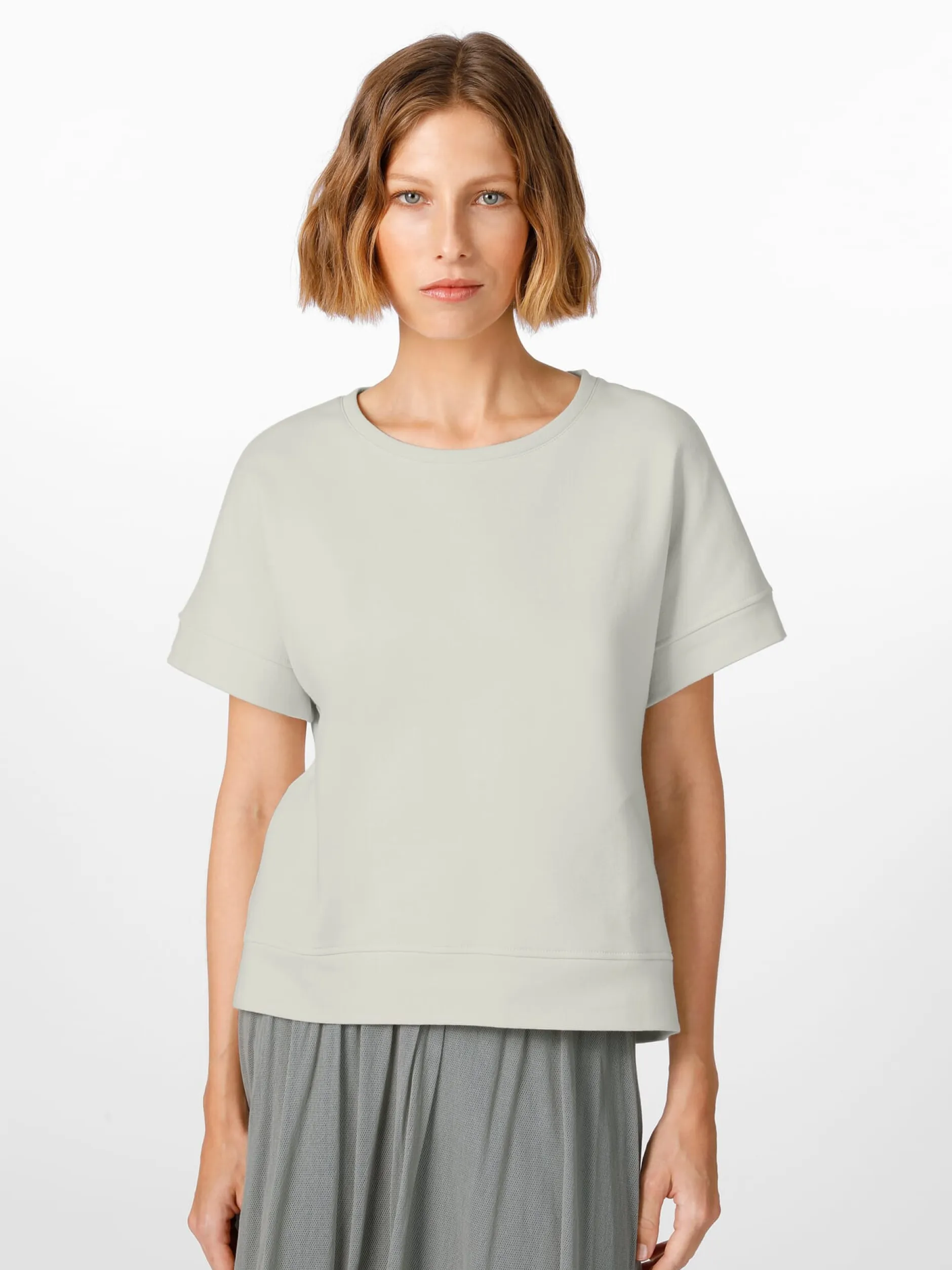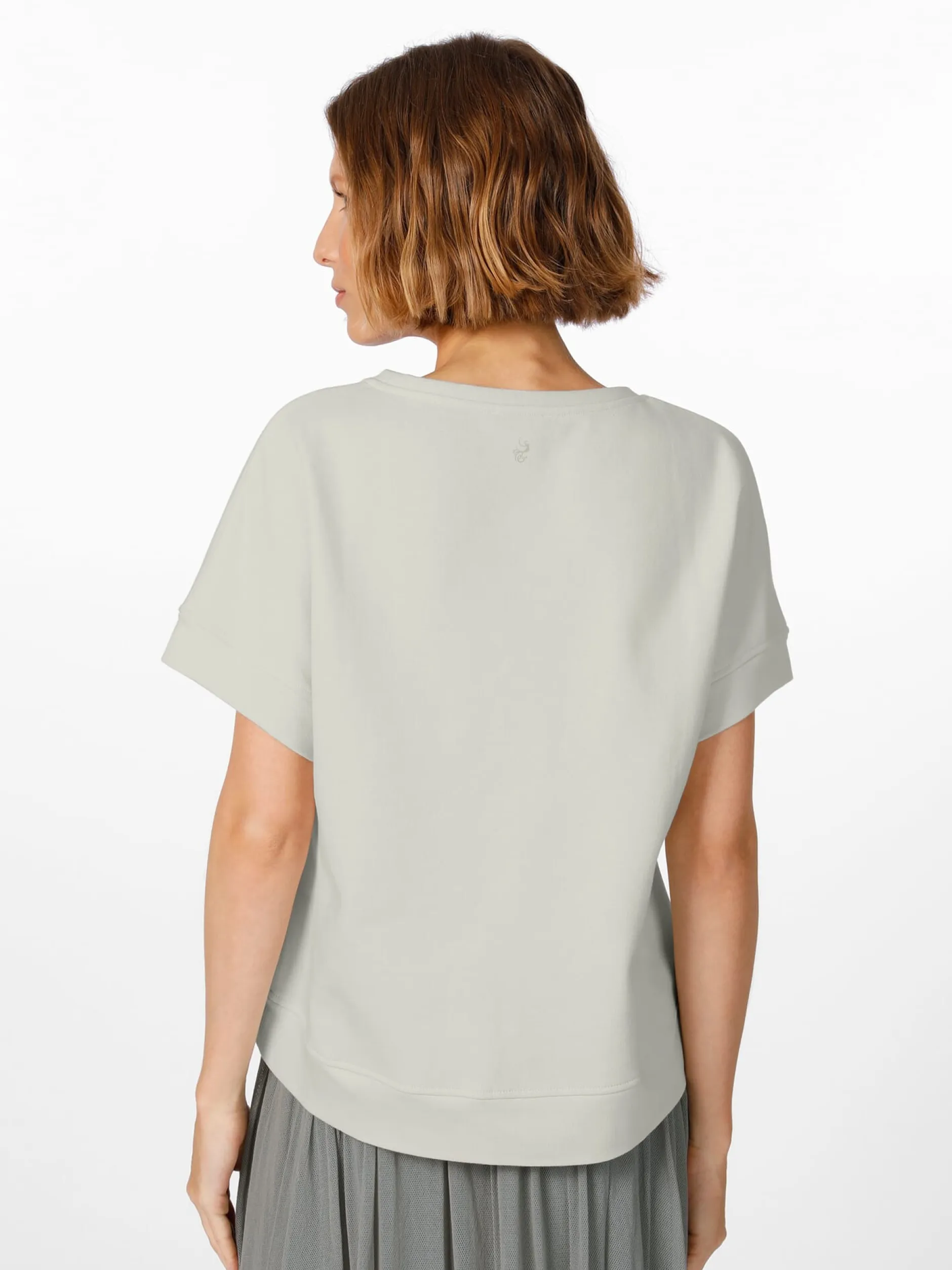 Tragekomfort steht hier im Vordergrund – dieses Shirt besteht aus einem hautsympathischen Sweatstoff, gewirkt aus reiner kbA-Baumwolle. Innen ist der Stoff leicht angeraut, was ihm eine äußerst weiche Haptik verleiht. Die überschnittene Form sorgt für einen bequemen und lässigen Sitz.