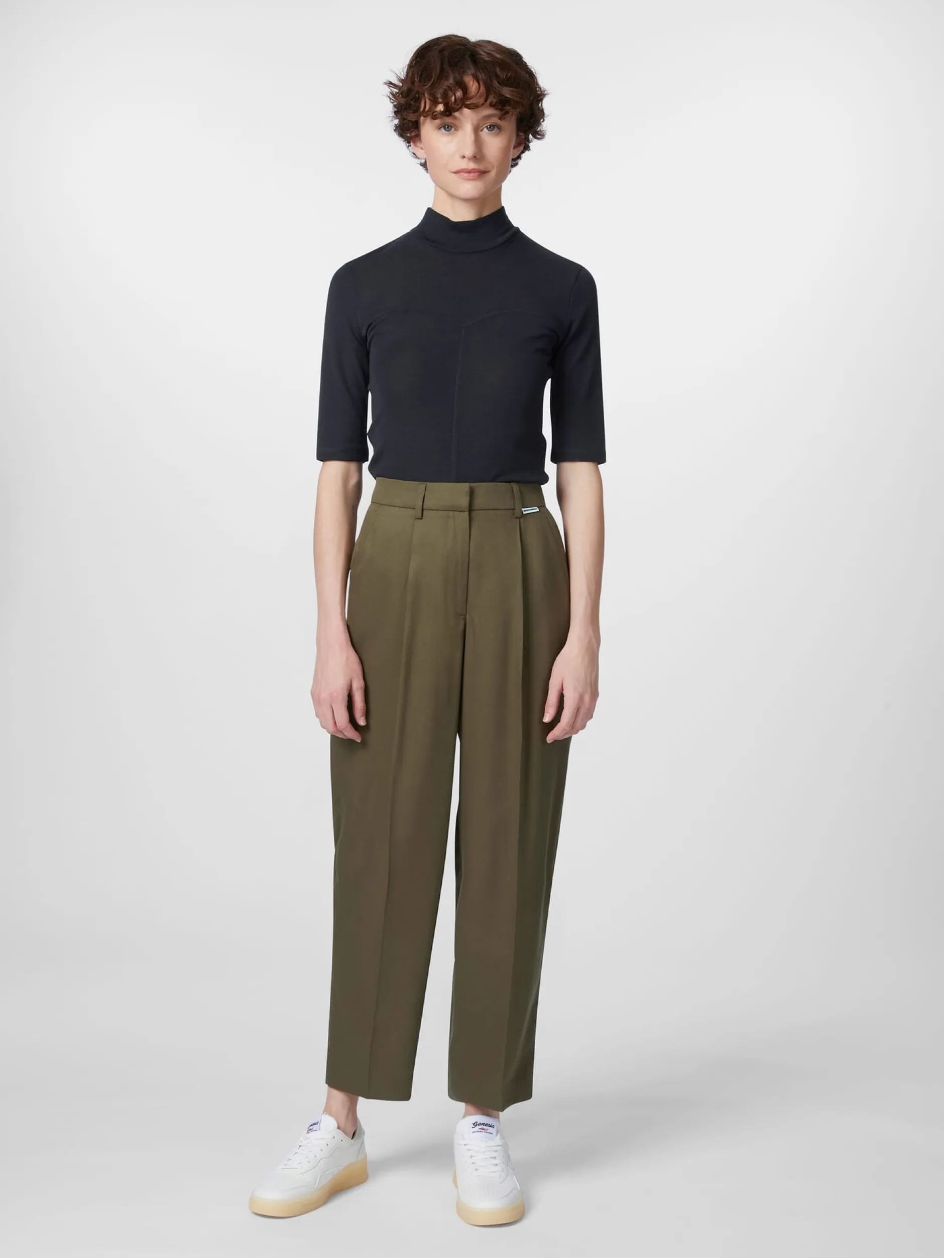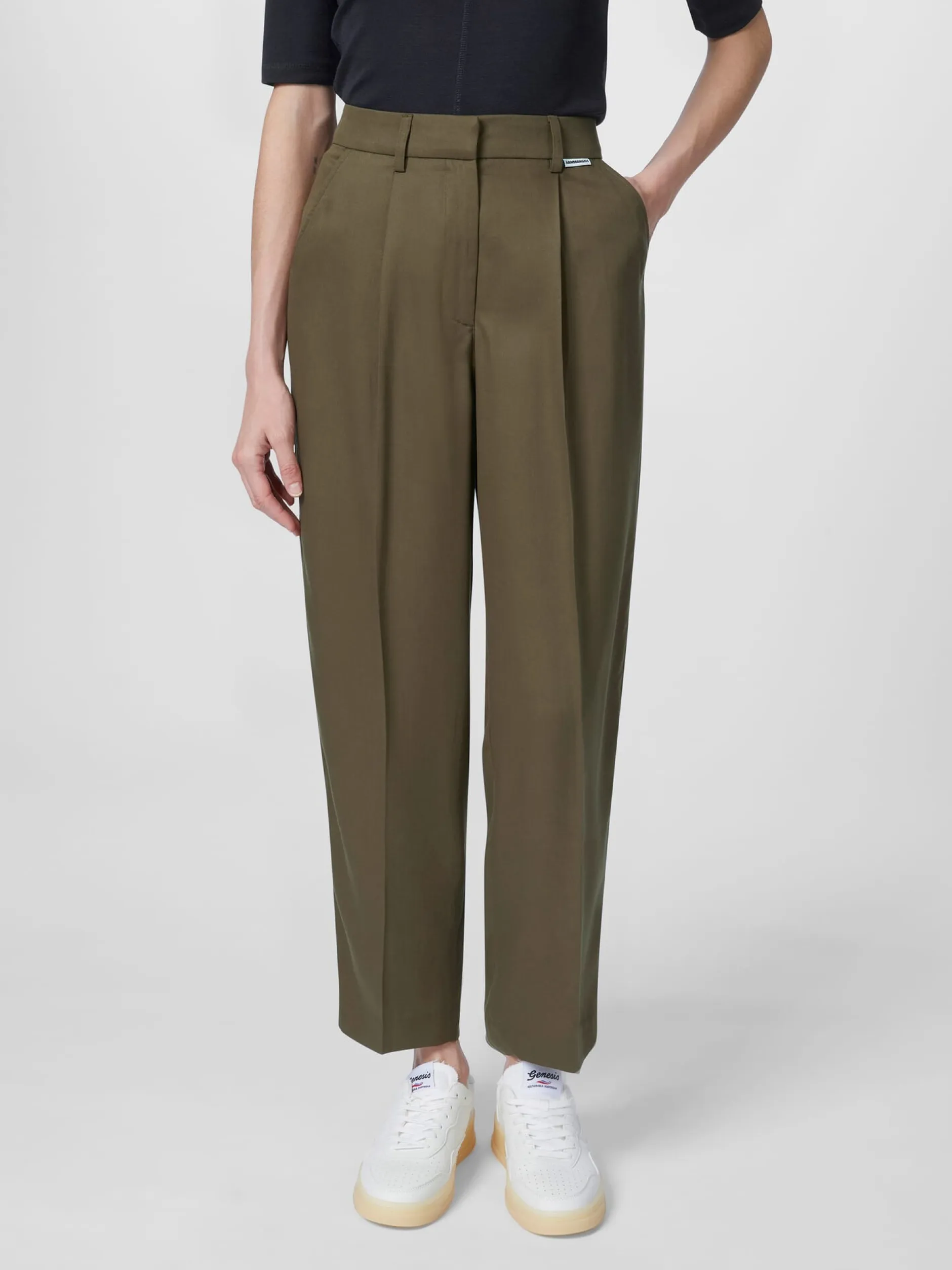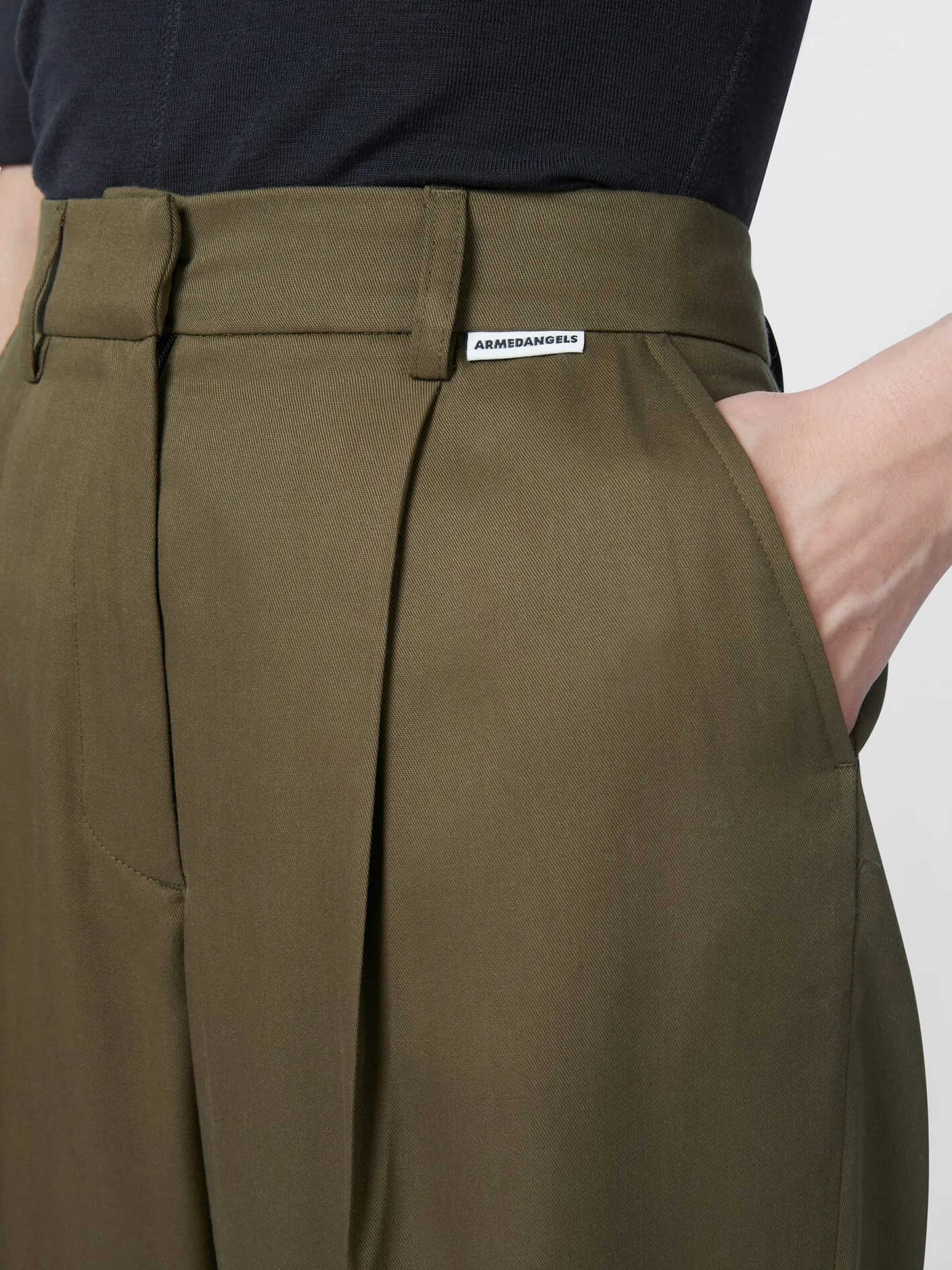 Diese elegante, etwa knöchellange Hose konfektioniert Armedangels aus Lyocell (TENCEL™ × REFIBRA™). Ein Bestandteil dieser von Lenzing neu entwickelten Regeneratfaser wird aus Holz gewonnen, das aus zertifizierten und kontrollierten Quellen stammt, der andere ist ein Zellstoff aus recycelten Baumwollresten der Textilindustrie. Diese neue Technologie leistet somit einen wichtigen Beitrag zur Kreislaufwirtschaft. Das hautsympathische und tragefreundliche Lyocell-Gewebe liegt glatt und weich auf der Haut, hat einen fließenden Fall und verfügt über eine gute Feuchtigkeitsaufnahme. Gearbeitet ist die Hose mit hohem Bund, leicht konischem Beinverlauf und Bügelfalten vorn und hinten. Bundfalten sorgen für eine gute Passform und einen bequemen Sitz. Die Hose ist mit zwei Eingrifftaschen und einer eingesetzten Gesäßtasche ausgestattet. Sie wird mittels Reißverschluss, Hosenhaken und Steinnussknopf geschlossen.