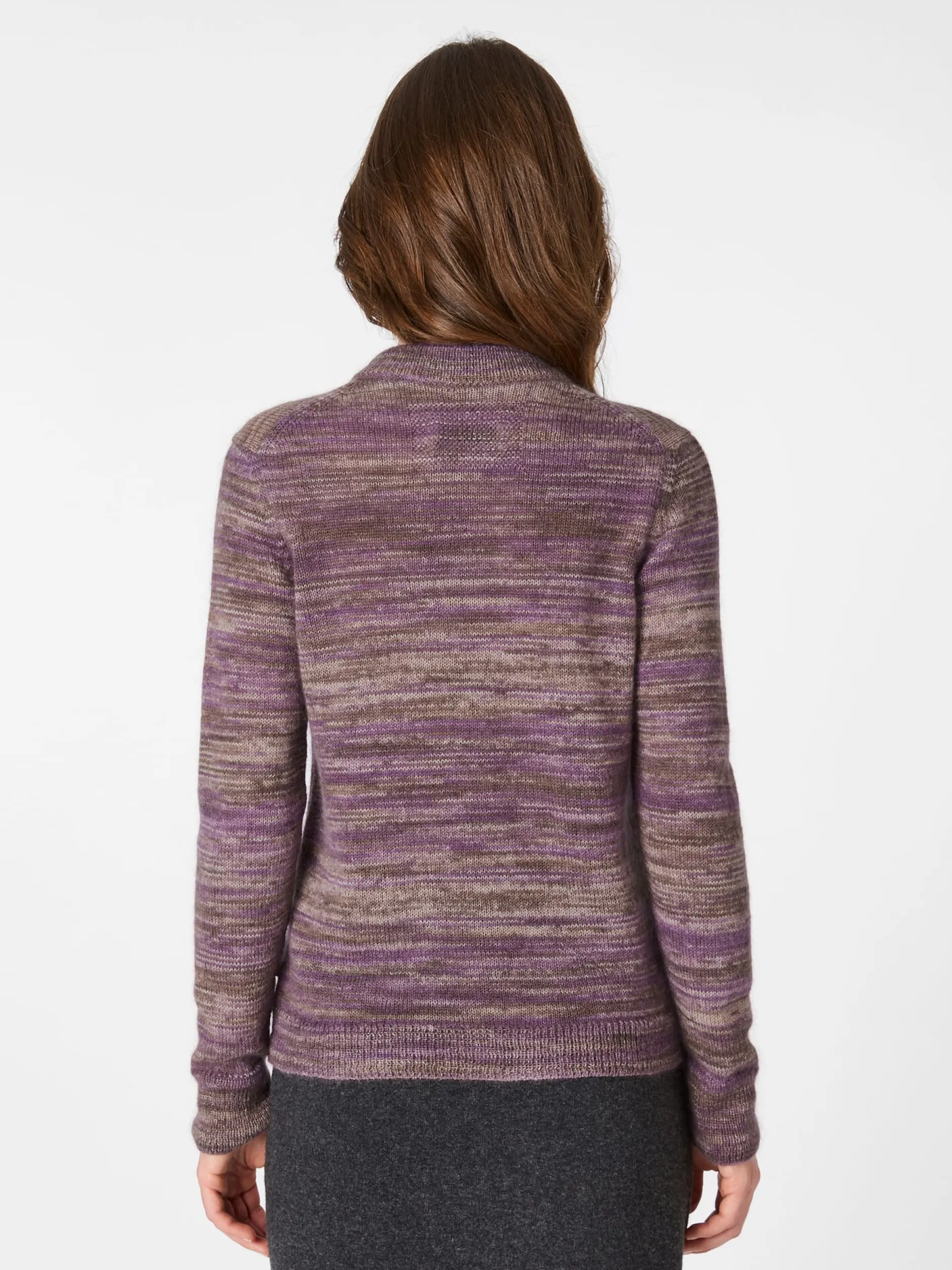 Zwei wunderbar wärmende Materialien werden bei dieser Strickjacke zu einem flauschig-weichen Gestrick verarbeitet: Wolle und Mohair, beide aus kontrolliert biologischer Tierhaltung. Die Fasern bieten nicht nur eine hervorragende Wärmeisolation, sie besitzen auch temperaturausgleichende Eigenschaften. So können Sie sich in dieser Strickjacke rundum wohlfühlen, selbst wenn die Temperaturen an einem kühlen Herbst- oder Frühlingstag unverhofft ansteigen. Zudem zeigt Mohair, das feine Haar der Angoraziege, einen subtilen Glanz, der in Verbindung mit den verschiedenfarbigen Garnen einen schönen Akzent setzt. Rippenstrickbündchen an Hals Ärmeln und Rumpf, zart schimmernde Papierknöpfe und ein Strickdetail im Nacken runden das Design ab.