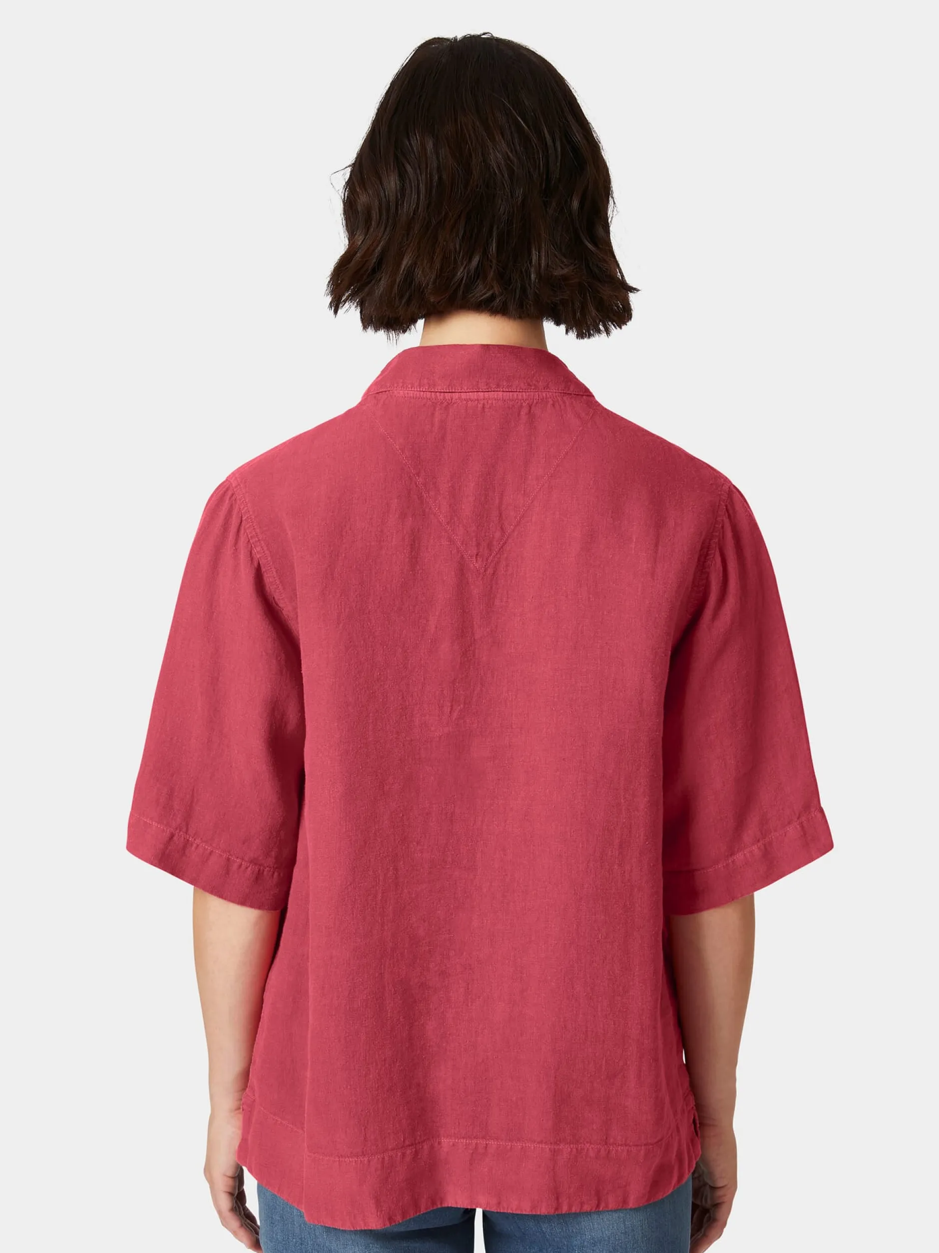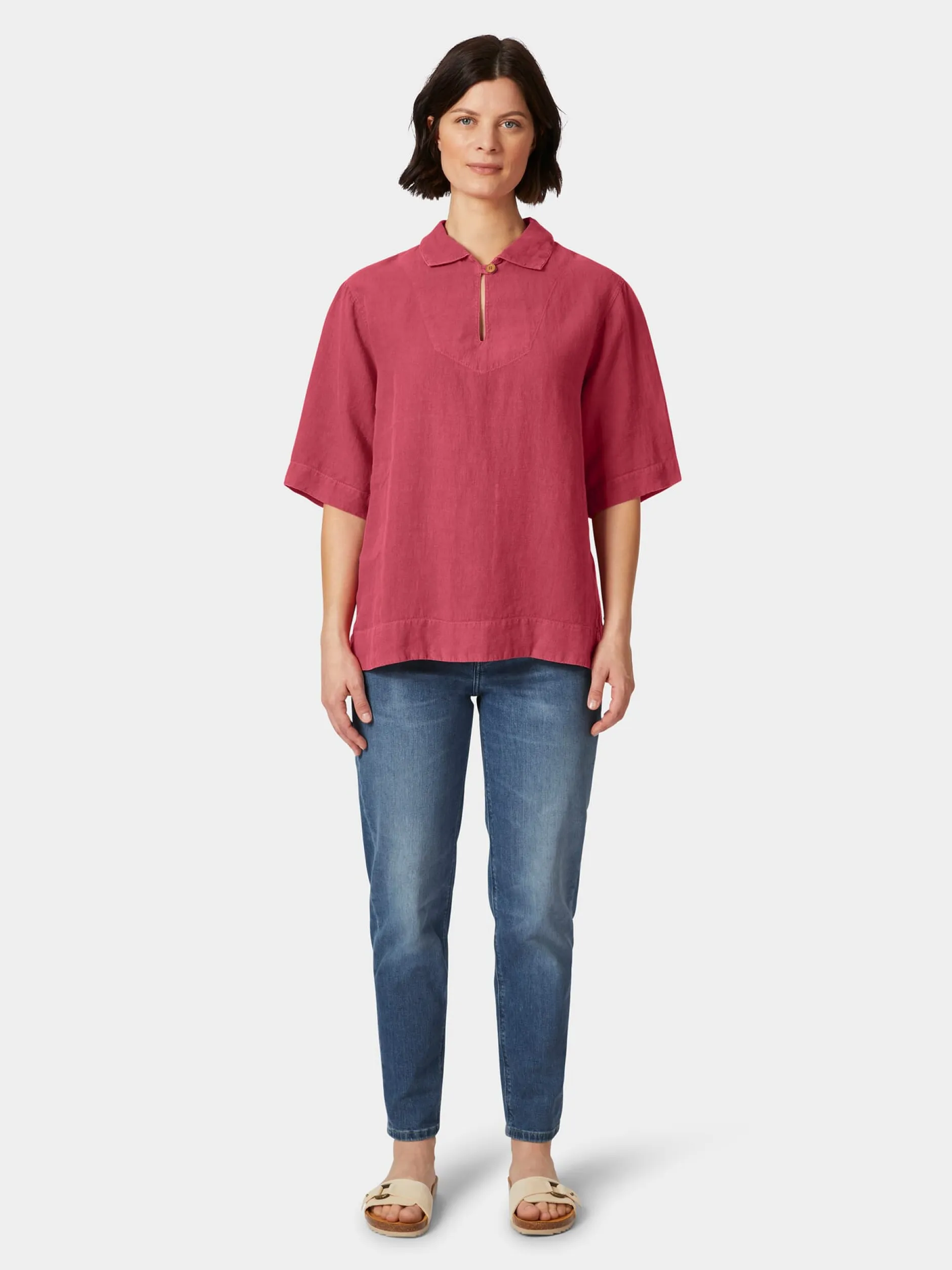 Dieses lässige Schlupfbluse hat ihr Vorbild in der klassischen Vareuse, dem traditionellen Fischerhemd. So ist sie zwar mit kurzem Arm, sonst aber ganz klassisch mit einem Einsatz, einem geknöpften Schlitz und einem umzuschlagenden Kragen gearbeitet. Der Knopf, der mitsamt einer Schlaufe den Schlitz am Halsausschnitt schließt, ist aus Bambus. Der Stoff passt perfekt: Leinen hat einen glatten, festen Griff, beim Tragen wirkt es kühlend und es ist atmungsaktiv. Armor lux verwendet für diese Schlupfbluse ein gewaschenes Leinen, was dem lässigen Schnitt noch den passenden Used Look hinzufügt.