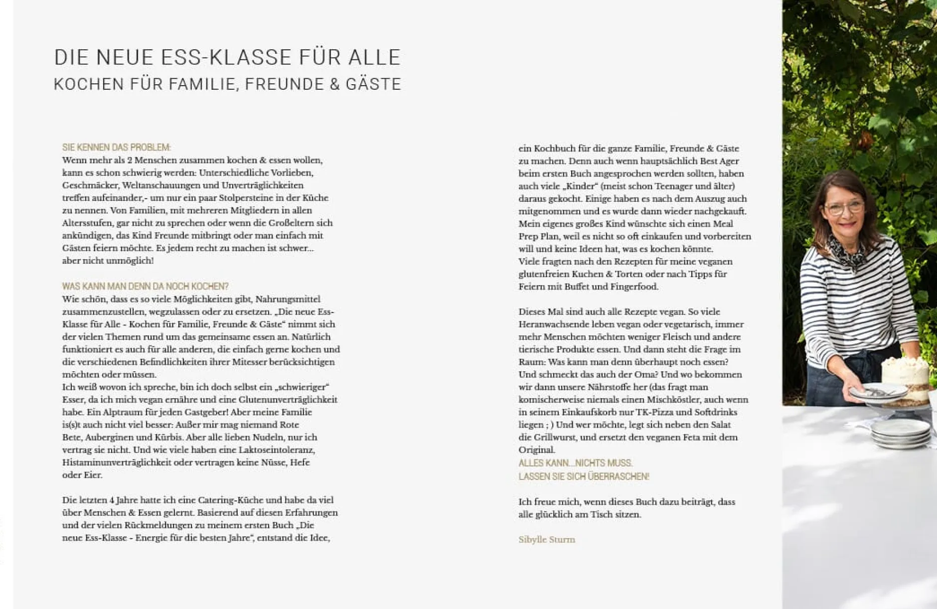 Die Neue Ess-Klasse für alle widmet sich den Herausforderungen, wenn einmal mehr als zwei Menschen am Herd stehen, und bietet Lösungen für unterschiedliche Vorlieben, Geschmäcker und Ernährungsformen. Vom alltäglichen Familienessen bis hin zu geselligen Zusammenkünften – hier gibt es Inspiration für jedermann. Ein besonderer Pluspunkt: Alle Rezepte sind pflanzlich, gluten- und laktosefrei, um den Bedürfnissen aller Familienmitglieder, Freunde und Gäste gerecht zu werden. Sibylle Sturm bietet eine breite Palette alltagstauglicher Rezepte und zeigt, wie einfach das gemeinsame Genießen von köstlichen Gerichten sein kann. In sechs Kapiteln werden Rezepte zu Themen wie »Alltagstauglich«, »Meal-Prep und Vorratshaltung«, »Wenn Besuch kommt«, »Fein Aufgetischt«, »Feste feiern« sowie »Kuchen für alle« präsentiert.