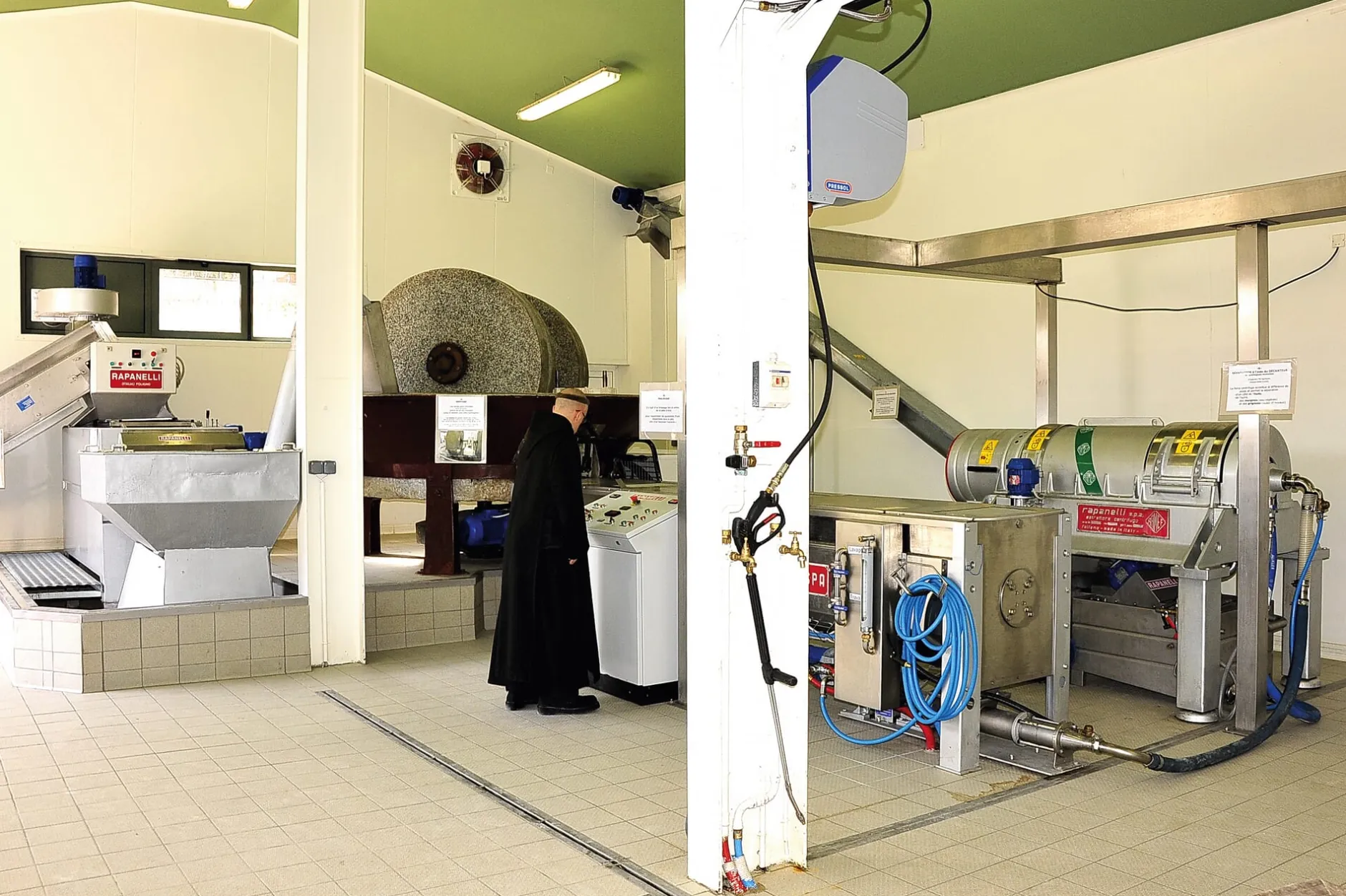 Öl, Wein und Brot sind urmenschliche Nahrungsmittel und haben im Christentum eine reiche symbolische Bedeutung. So kommt es nicht von ungefähr, dass die Benediktiner der provenzalischen Abtei St. Madeleine in Le Barroux sich gerade der Herstellung dieser drei Lebensmittel widmen und als einziges Kloster in Frankreich eine Ölmühle betreiben. Ihre Lebensregion zwischen den Dentellen und dem Mont Ventoux ist reich an Olivenbäumen, die sich mit Weingärten abwechseln. Die Ölbaumkultur hat für das Kloster auch eine ganz praktische Bedeutung, da auf diese Weise nicht nur eine auf Generationen angelegte und immer ertragreicher werdende Landwirtschaft entsteht, sondern auch ein gutes Betätigungsfeld für die Handarbeit der Mönche. Die Ernte der Oliven zwischen November und Dezember haben sie bewusst nicht mechanisiert. Das schont zudem die empfindlichen Früchte und erhöht somit die Qualität des Öls. Solange die Anpflanzungen sich noch im Aufbau befinden, müssen aus der Umgebung auch noch Oliven zugekauft werden. Wie lange die Oliven zwischen Ernte und Verarbeitung eventuell noch lagern, hängt davon ab, welche Aromen man durch einen unterschiedlichen Reifegrad oder sogar eine kontrollierte Fermentation im späteren Öl erhalten möchte.