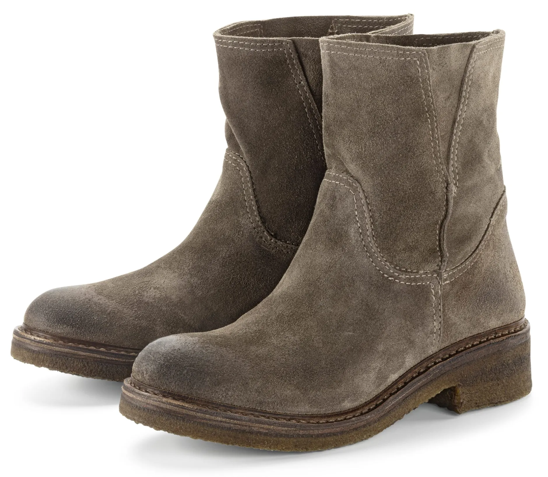 Durch und durch bequem ist dieser Boot aus dem Hause Astorflex. Und wie bei der italienischen Schuhmanufaktur üblich, kommt bei ihm vegetabil gegerbtes Leder zum Einsatz: Veloursleder aus toskanischen Meistergerbereien als Obermaterial, weiches, glattes Kalbleder bei Futter und Decksohle. Die Kreppsohle ist aus reinem Naturkautschuk, was für eine gute Trittdämpfung sorgt. Die eher weiche, ungefütterte Stulpe sorgt für einen lässigen Sitz. Sie ist mit seitlichen, dreieckigen Einsätzen versehen, die ein schnelles An- und Ausziehen ermöglichen. Ein charakteristisches Merkmal bei Astorflex ist die sogenannte „Idealnaht“ entlang des Sohlenrandes, die dem Schuh Flexibilität und Haltbarkeit verleiht.