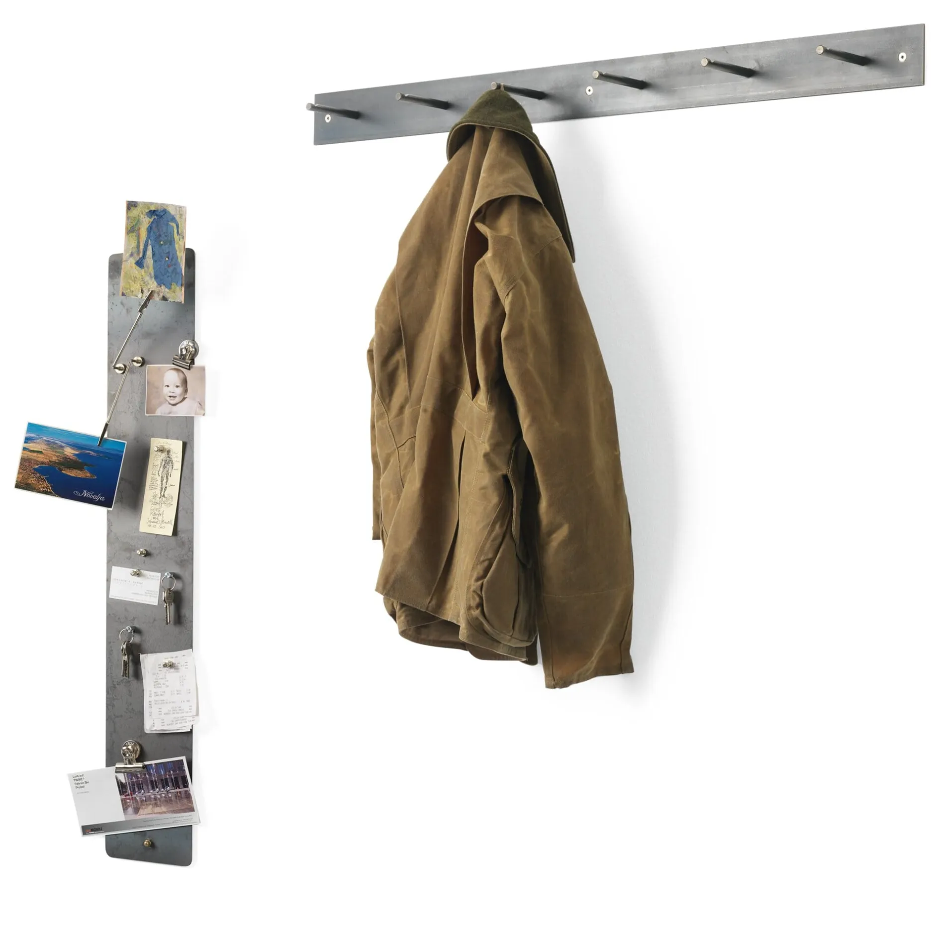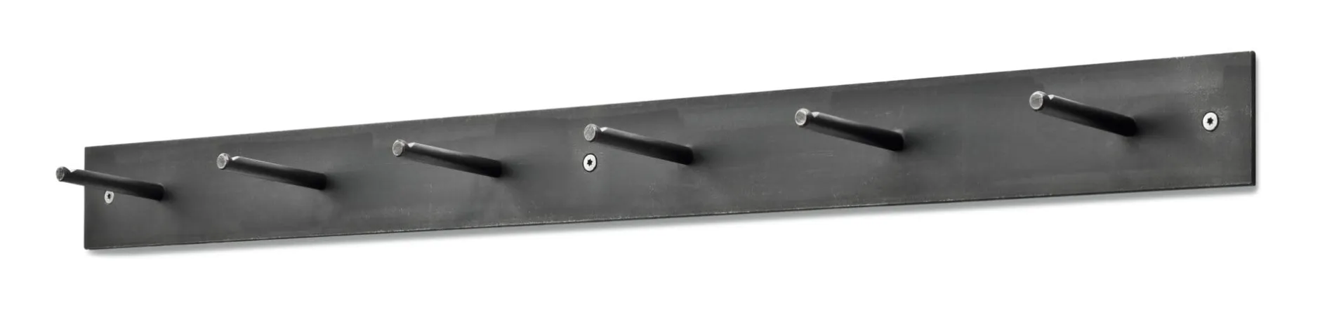 Reduzierter und gleichzeitig funktionaler geht es kaum. Diese Garderobenleiste besteht aus einem Stück Flachstahl und sechs gekerbten Rundeisen als Haken. Sie sind so angebracht, dass auch bei der Montage von zwei oder mehr dieser Garderoben nebeneinander die Abstände der Haken immer gleich sind. Das Material ist nicht rostfrei, der Rohstahl ist jedoch geölt. Rost ist somit außerhalb von Feuchträumen kein Problem. Aus Deutschland.