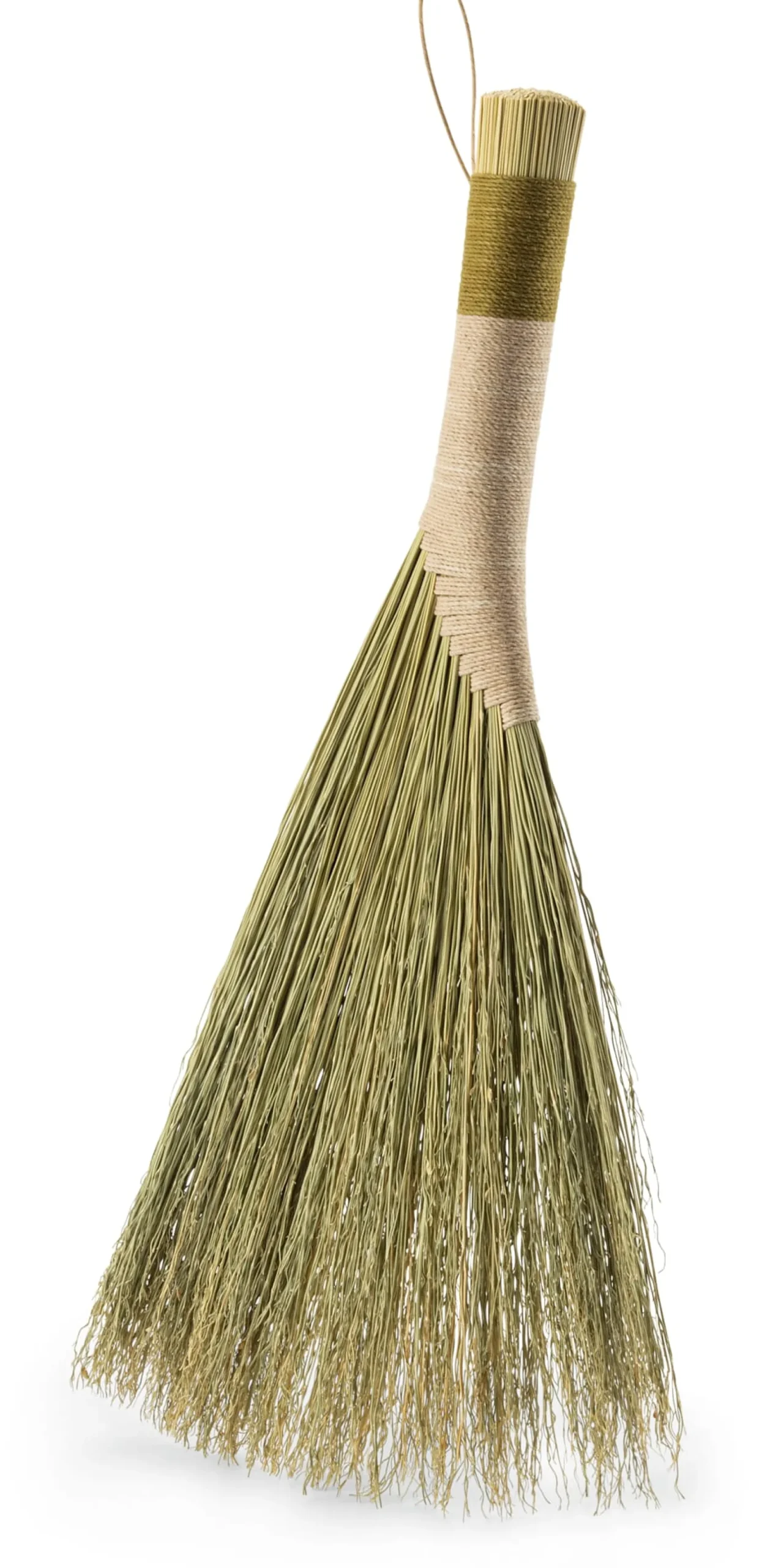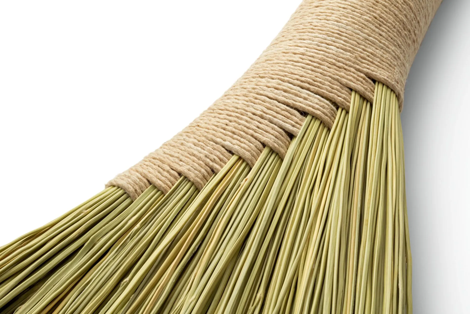 Besatz und Griff sind bei diesem Handbesen eins: Sie werden von Hand aus getrockneten Halmen der Sorghumhirse gebündelt, die aus offensichtlichem Grund auch „Besenkorn“ genannt wird. Feine Rispenstände der Sorghumhirse bilden die Besatzspitze, sodass eine größere (fegende) Oberfläche entsteht, die robust ist und doch so sanft ausfällt, dass Sie Ihre Möbel oder Böden nicht verschrammt. Die glatten, soliden Halmenden bilden hingegen den Griff, der mithilfe einer Wicklung aus festem Baumwollzwirn gesichert wird. Um dem Handbesen sowohl zu Form als auch zur Ästhetik zu verhelfen, wendet die estnische Herstellerin für die Wicklung ein traditionelles handwerkliches Verfahren ihrer Heimat an: Zum Besatzende hin stuft sie die Bindung ab und erzielt so die praktische, flache Form des Besens und das charakteristische geometrische Muster.