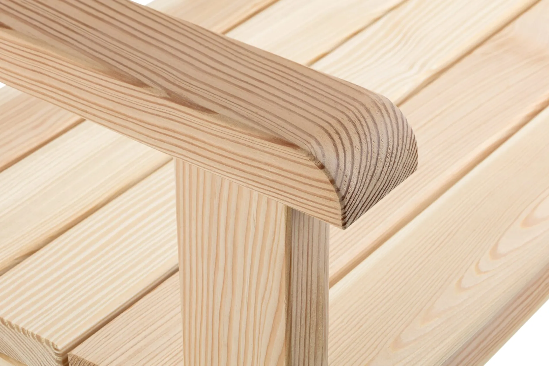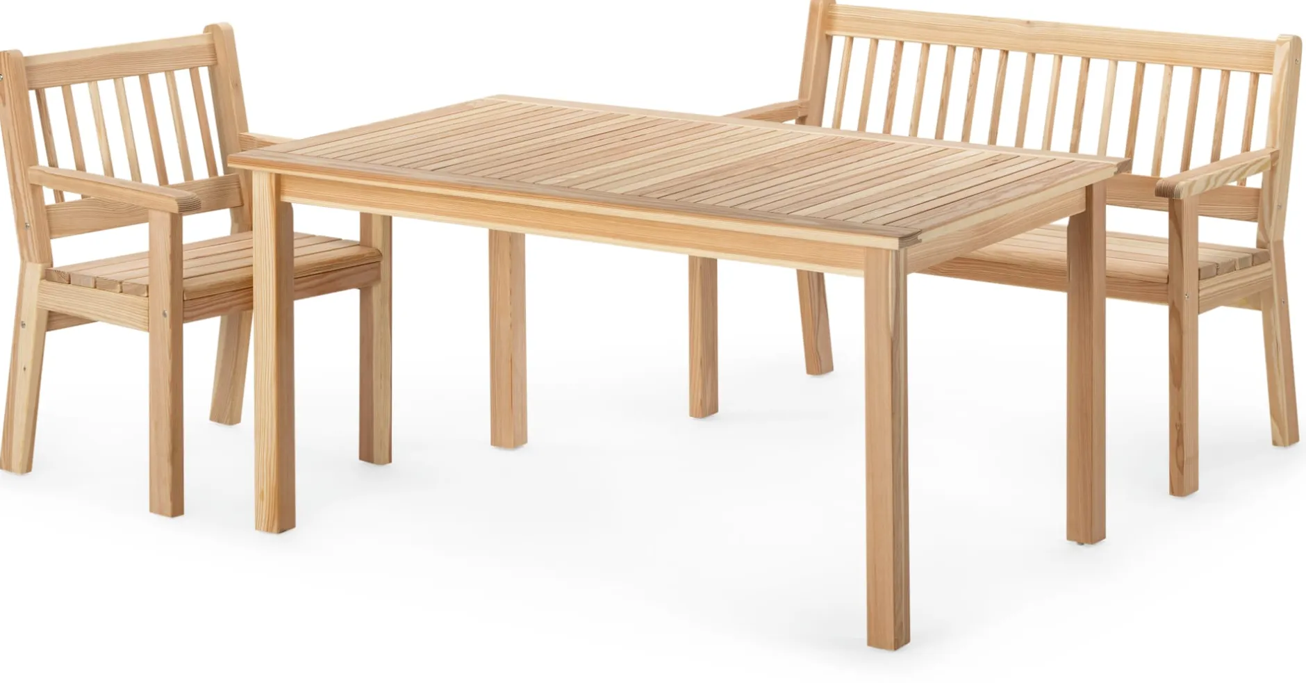 Erwecken diese Gartenmöbel nicht den Eindruck, als kämen sie geradewegs aus einem englischen Landschaftspark, oder als wären sie soeben der Kulisse der Neuverfilmung eines Romans von Jane Austen entsprungen? Wir finden, in Form und Stil passten sie perfekt dorthin. Auch das sprichwörtliche englische Wetter würde Sessel, Bank und passendem Tisch nur wenig anhaben können, sind sie doch alle drei aus einem Holz gemacht, das aufgrund seines Harzgehaltes auch unbehandelt ausgesprochen witterungsbeständig bleibt. Zu ihrem eleganten Erscheinungsbild trägt das Nadelholz mit dem charakteristischen Duft in jedem Falle bei. Achten Sie einmal auf die Qualität der Verarbeitung: Nahezu astrein, ist jede einzelne Latte, jedes Bauteil sauber zugesägt, absolut glatt geschliffen und sogar nach Farbverlauf und Maserung sortiert. So kommt auch der natürliche, in ein rötliches Braun tendierende Farbton des Holzes besonders zur Geltung.