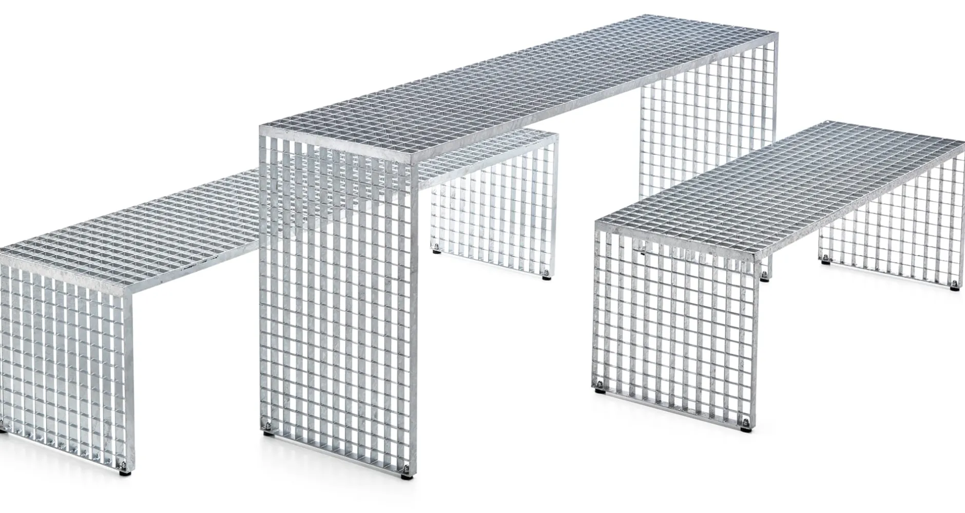 Die modularen Elemente der Serie SKWER stellen somit in Form, Material und unübertroffener Robustheit eine wirkliche Alternative zu Holz- und Kunststoffmobiliar dar. Rostfrei und unempfindlich gegen Witterungseinflüsse jeglicher Art nimmt die feuerverzinkte Oberfläche im Laufe ihres Alterns eine adelnde mattgraue Patina an.