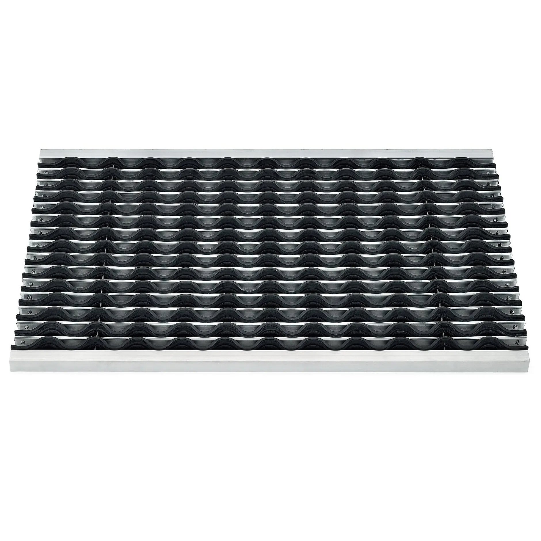 Die Fußmatte aus Westfalen wird eigentlich nur – in deutlich größeren Abmessungen für die Eingangsbereiche öffentlicher Gebäude produziert. Wir bringen sie hier in einer Größe für den Privatgebrauch mit den gleichen Produktvorteilen: Die wellenförmigen Lamellen sind aus einem in der Autoindustrie bewährten, gegen Sauerstoff, Ozon, Fette und Öle resistenten Kunstkautschuk. Das rutschfeste Material wird durch korrosionsbeständige Aluminiumprofile stabilisiert. Das ganze System wird in Querrichtung durch Edelstahlseile zusammengehalten. Die Matte lässt sich zerlegen und reparieren.