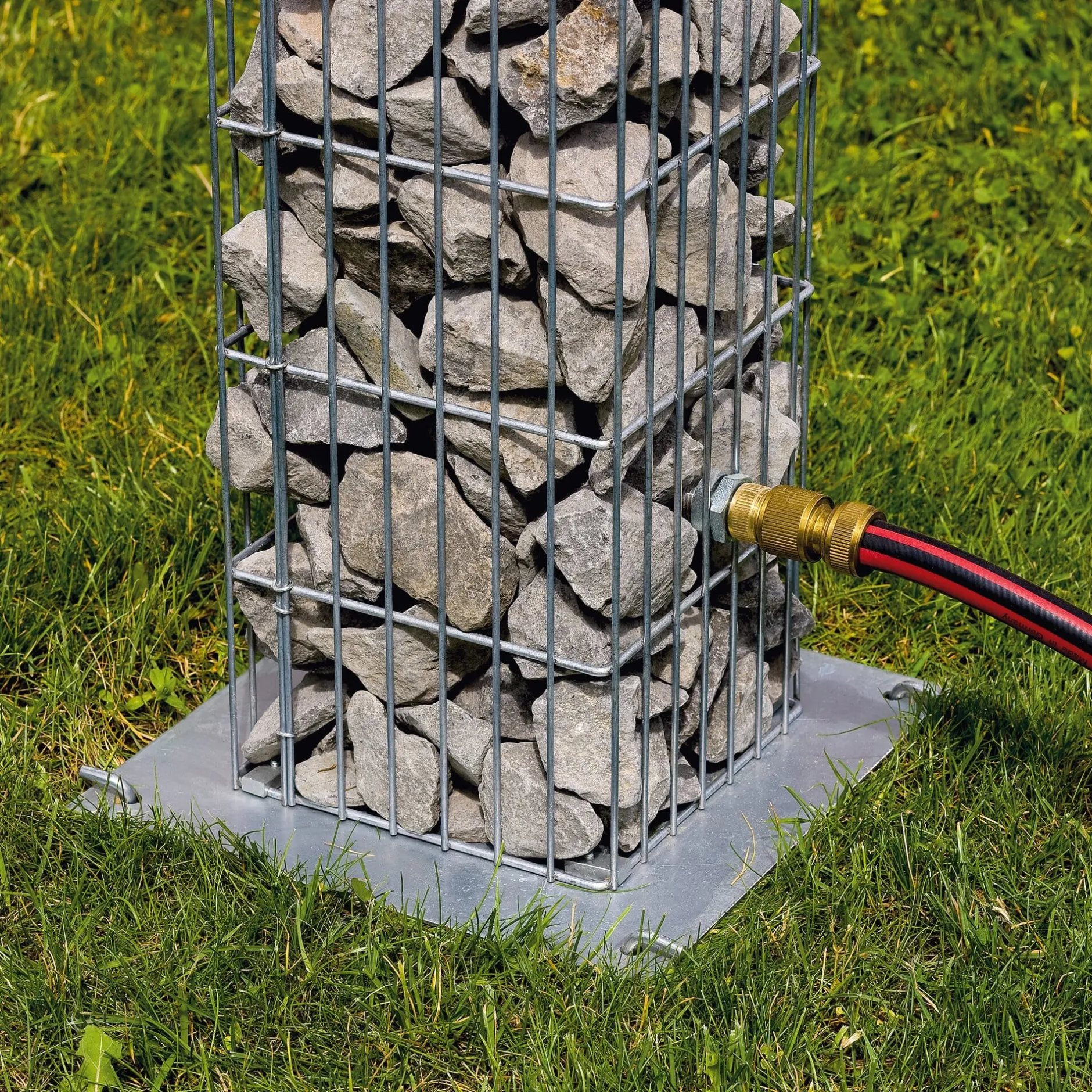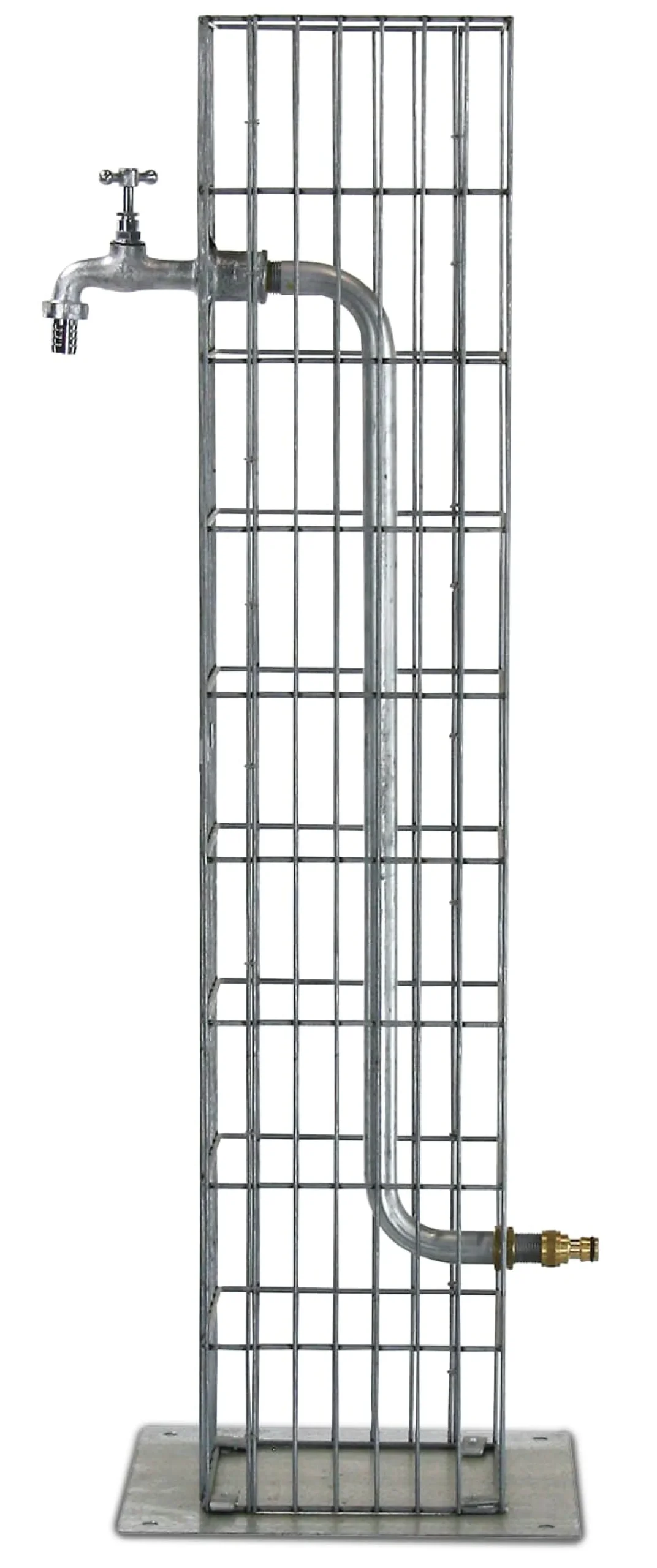 Diese schmale Säule ist aus dem dauerhaft rostgeschützten Draht gemacht, der sonst zur Gabionenherstellung verwendet wird. Sie steht auf einer quadratischen Bodenplatte aus Stahl, die sich leicht verankern lässt: Zur Befestigung auf lockerem Erdreich liefern wir vier „Heringe“ mit; auf festem Untergrund können Sie die Bodenplatte einfach verschrauben. Ein Schlauch wird an den unten installierten Stecker angeschlossen; der Hahn zur Wasserentnahme ist so angebracht, dass auch hohe Gefäße daruntergestellt werden können.