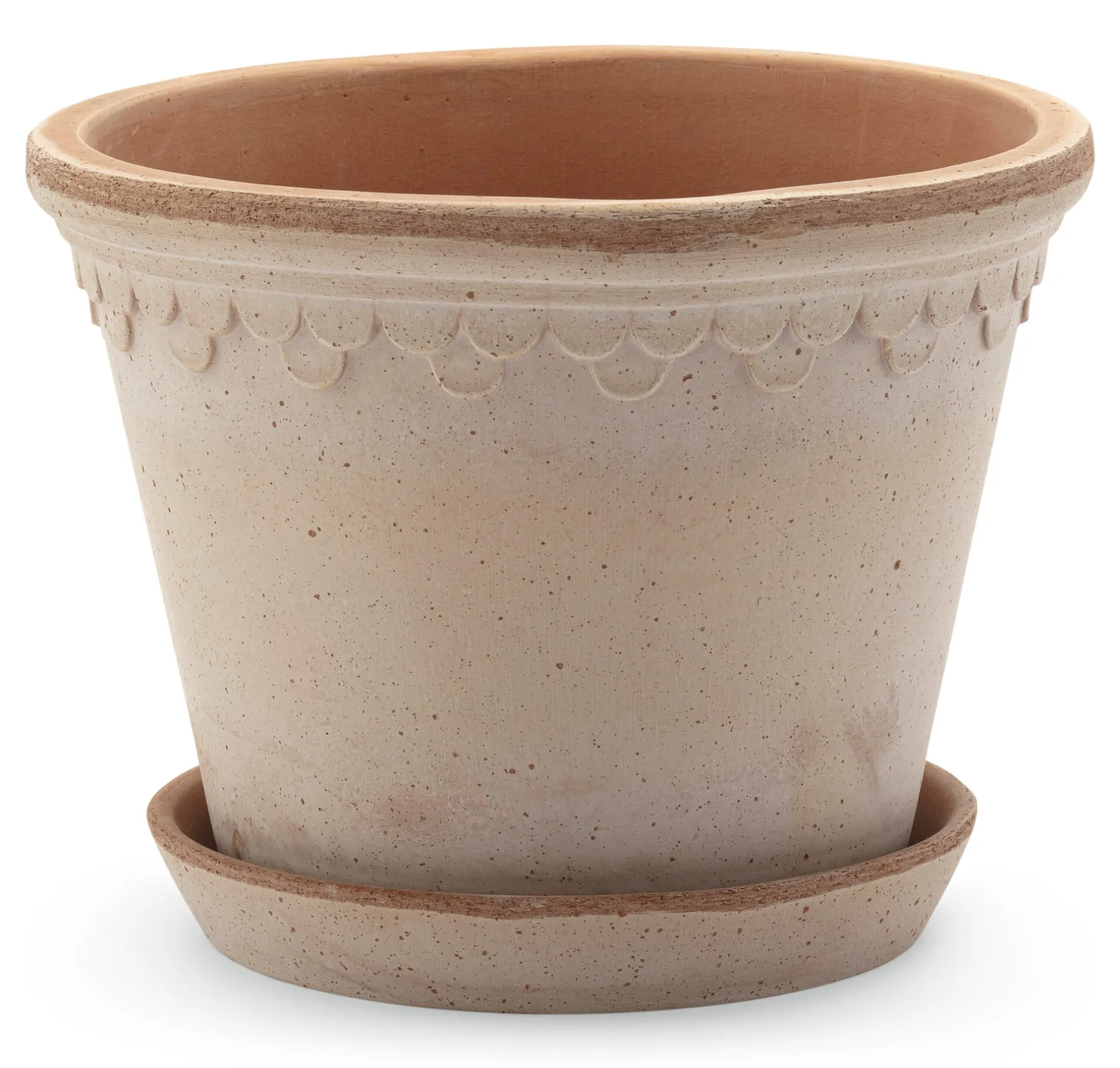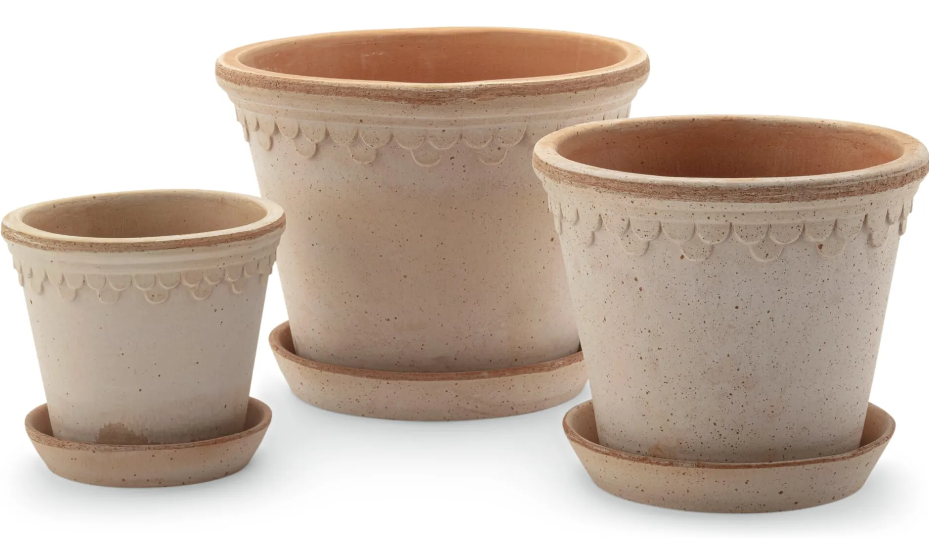 Königlichen Ursprungs ist der Entwurf, der den Københavener-Töpfen von Bergs Potter vorausging. Ähnliche Modelle gab es schon einmal um das Jahr 1860 herum. Sie stammten sämtlich aus dem „dänischen Versailles“, wie Schloss Fredensborg im Norden der Insel Seeland bis heute genannt wird. Friedrich der IV. von Dänemark und Norwegen ließ die Schlossanlage zwischen 1720 und 1722 als Sommerresidenz und Jagdschloss erbauen. Eine Töpferwerkstatt muss wohl zum königlichen Besitz gezählt haben. Steffen Berg, Bergs-Potter-Geschäftsführer der zweiten Familiengeneration, fand die historischen Pflanzgefäße durch Zufall in einem Gewächshaus einer aufgelassenen Gärtnerei und ließ sich zu einer Neuauflage nach eigenem, dezent modernisiertem Entwurf inspirieren. Besonders gelungen ist das zurückhaltende Schuppendekor. Wir schätzen diese Töpfe auch deshalb, weil der passende, aus demselben Ton getöpferte Untersetzer gleich mitgeliefert wird. Nicht nur, dass beide Teile zusammen ein harmonisches Gesamtbild ergeben – die Untersetzer helfen ebenso dabei, Gießwasser effizienter einzusetzen, da sie Überschüssiges auffangen und zur späteren Verwendung bereithalten. Bei den doch eher kleineren Topfgrößen ist das ein nicht zu unterschätzender Vorteil, gerade wenn die Gefäße draußen auf dem Balkon oder auf der Terrasse stehen, wo in warmen Sommern ohnehin häufiger gegossen werden muss.