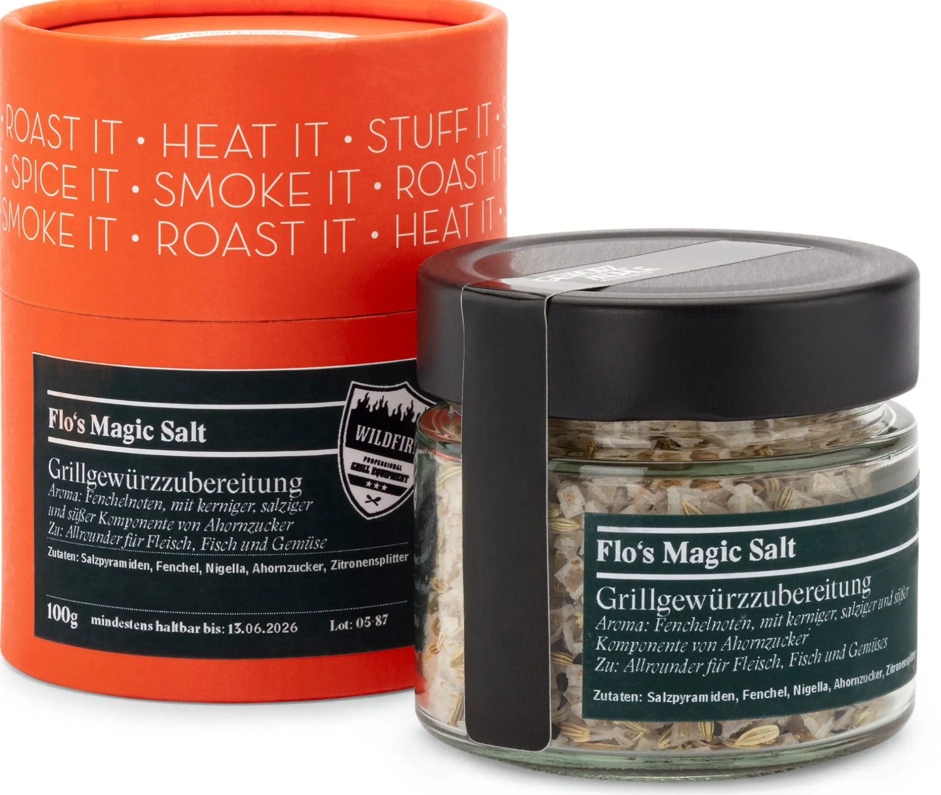 Namensgeber für diesen Barbecue-Allrounder ist Flo Knecht, der Gründer der Big Green Egg Deutschland GmbH. Gemeinsam mit der Gewürzmühle Rosenheim hat er eine Mischung entwickelt, deren Magie vor allem darin liegt, dass sie mit nur fünf Zutaten einen bemerkenswerten Wohlgeschmack erzeugt: milde, pyramidale Salzkristalle mit Crunch-Effekt, grüner Fenchel mit süßlichen, anisartigen Noten, kerniger Schwarzkümmel, fruchtige Zitronensplitter und Ahornzucker, der an Karamell und Süßholz erinnert. Big Green Egg Flo’s Magic Salt ist – wie gesagt – ein echter Allrounder: Es schmeckt zu Schweinesteak, Wild und Lamm ebenso gut wie zu Lachs, Wolfsbarsch und Gemüse vom Grill.