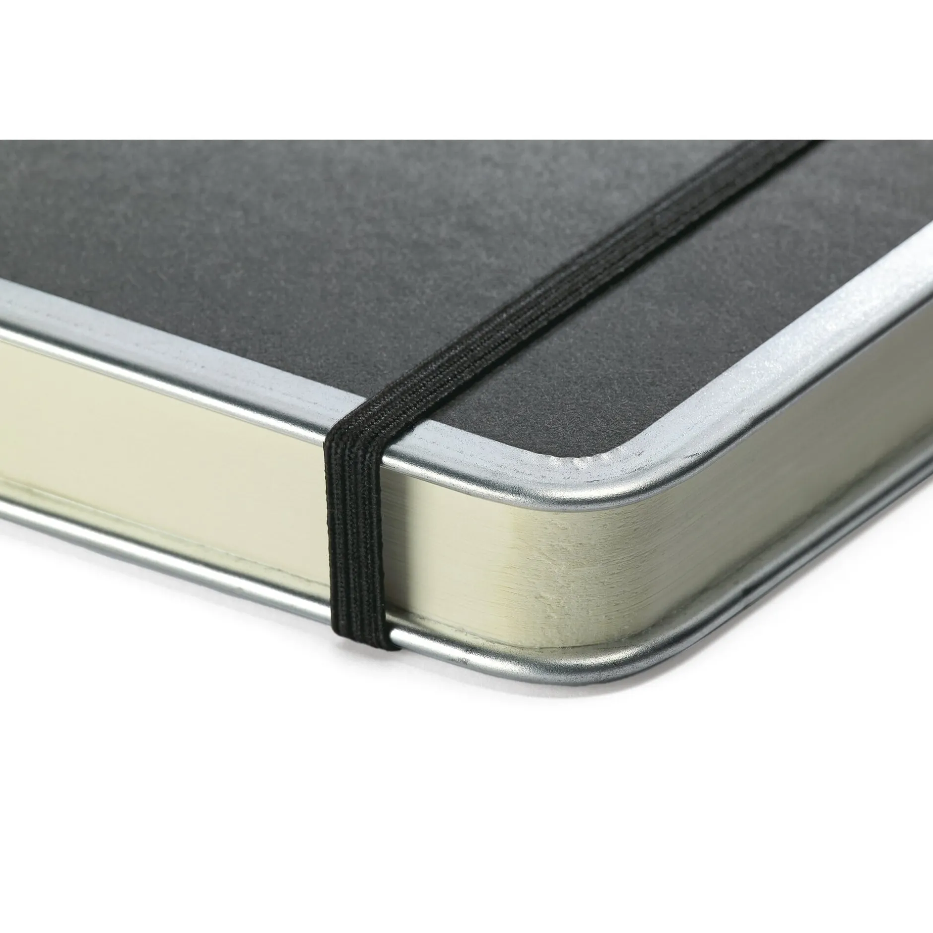 2 mm starker Texoneinband mit metallverstärkten Kanten. Chamoisfarbenes 90-g-Papier, fadengebunden. Mit laminiertem Griffregister. Gummibandverschluss.