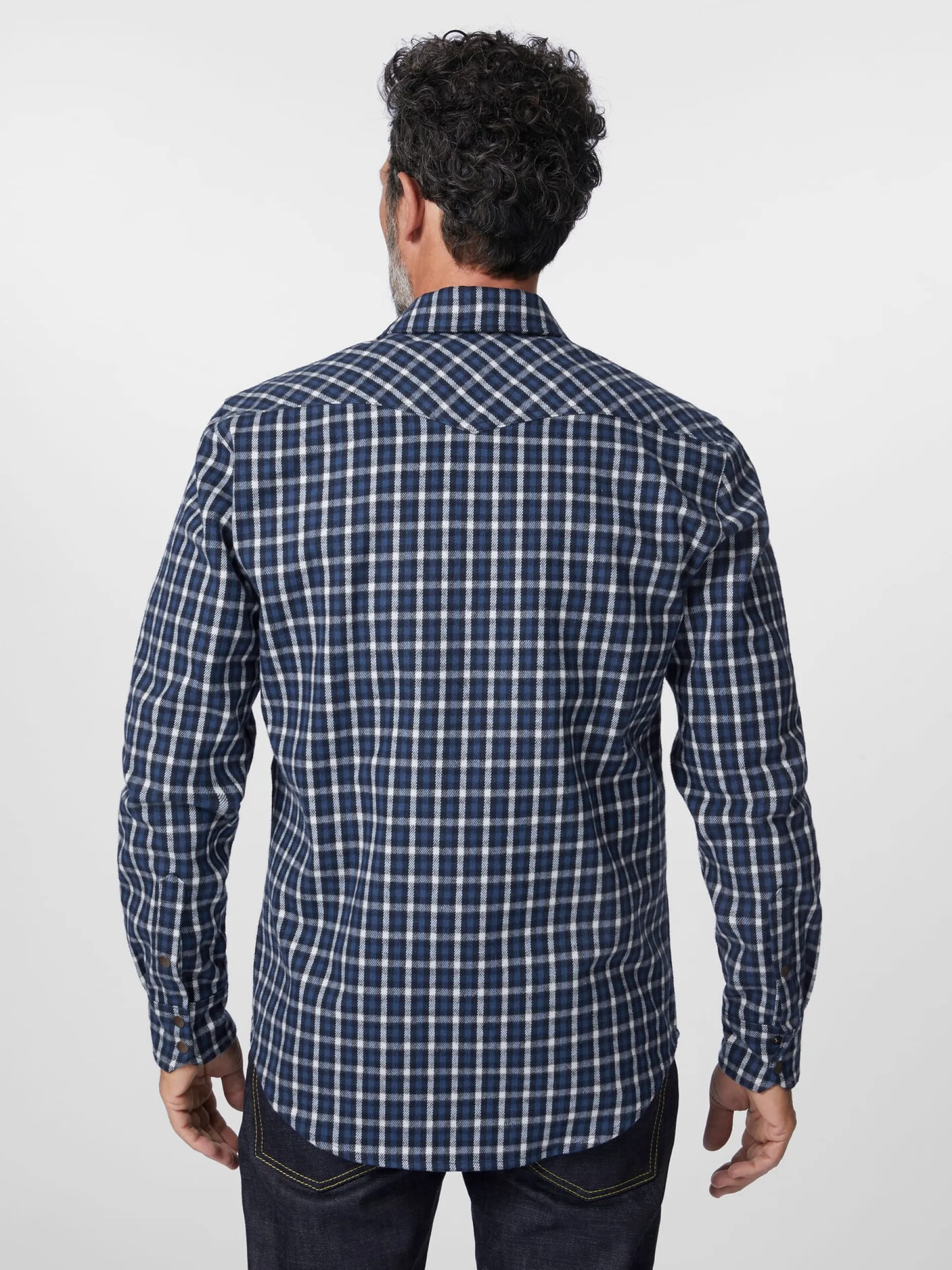 Ein gewichtiger weicher Baumwollflanell ist der Stoff, aus dem dieses Hemd gemacht ist. Passend zur markanten Haptik zeigt er ein farbkräftiges, blau-weißes Karomuster, das in Teilen einen deutlich sichtbaren Köpergrat zeigt. Geschlossen wird das Hemd mit kupferfarbenen Metalldruckknöpfen, zwei mustergetreu aufgesetzte Brusttaschen mit geknöpften Patten nehmen Kleinteile des täglichen Bedarfs auf.