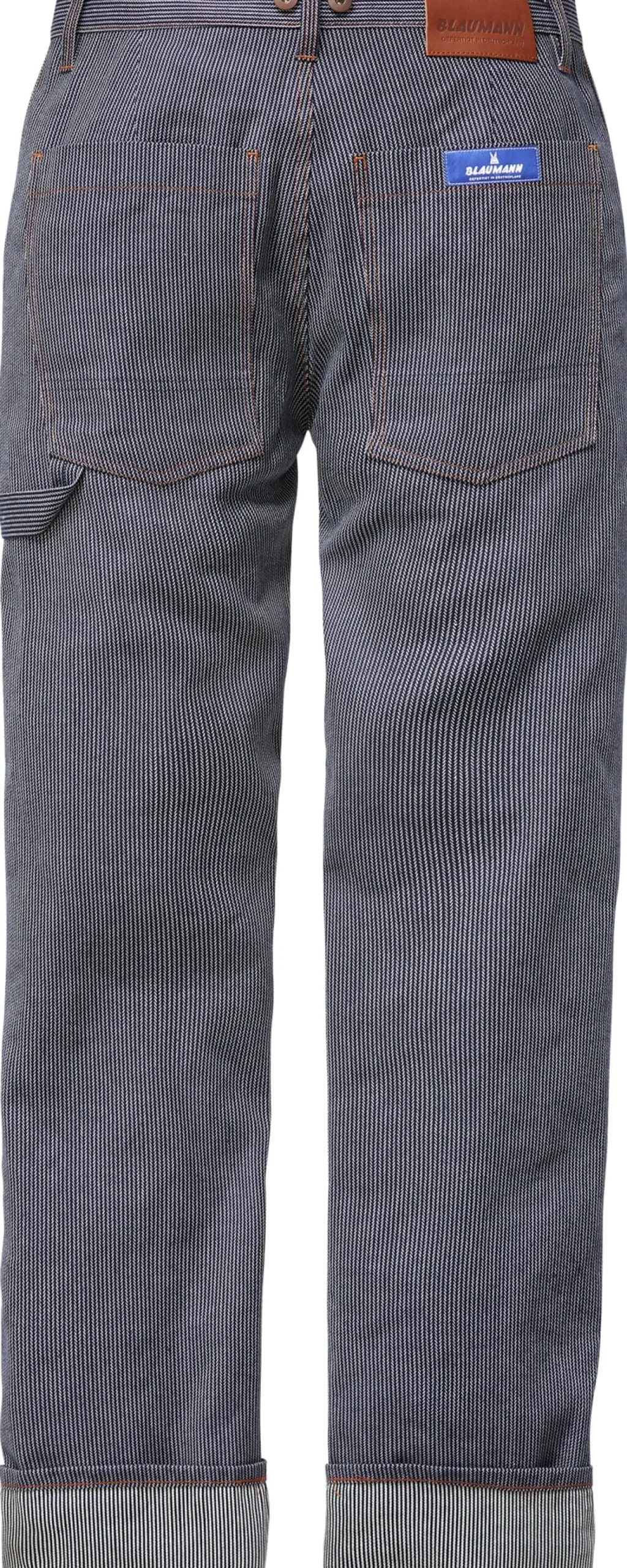 Das markante und kontrastreiche Fischgratgewebe für diese Hose bezieht Blaumann aus einer japanischen Weberei. Passend zum kernigen Material ist auch der Schnitt: sein Vorbild ist eine klassische Arbeitshose im 5-Pocket-Stil mit zusätzlicher Hammerschlaufe. Die Hose wird mittels Knopfleiste und Knopf geschlossen und sie ist mit Gürtelschlaufen und Hosenträgerknöpfen ausgestattet.