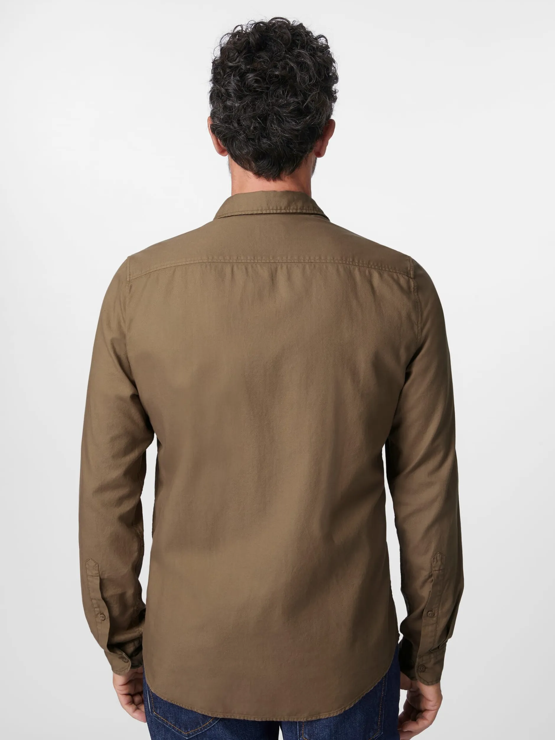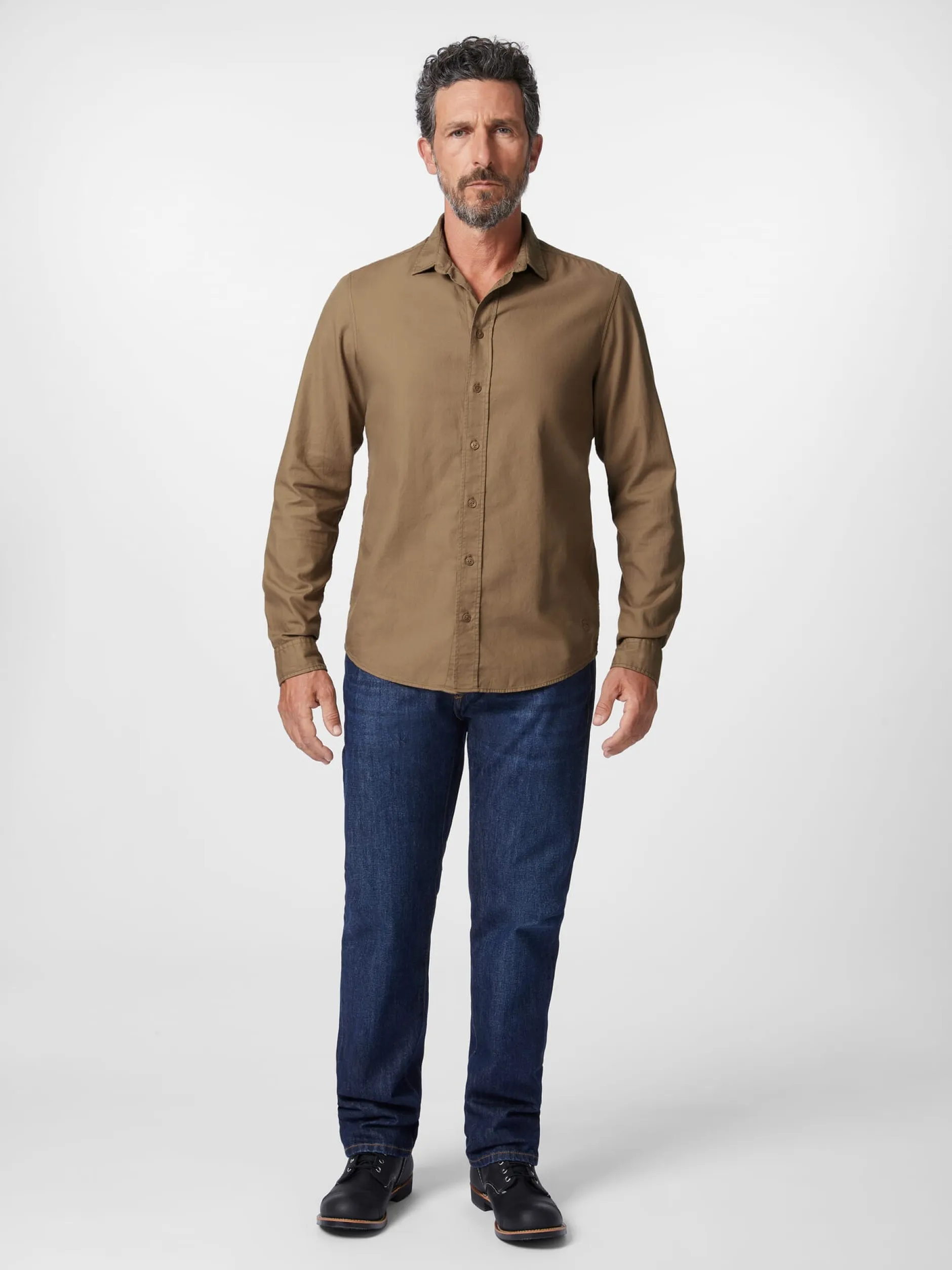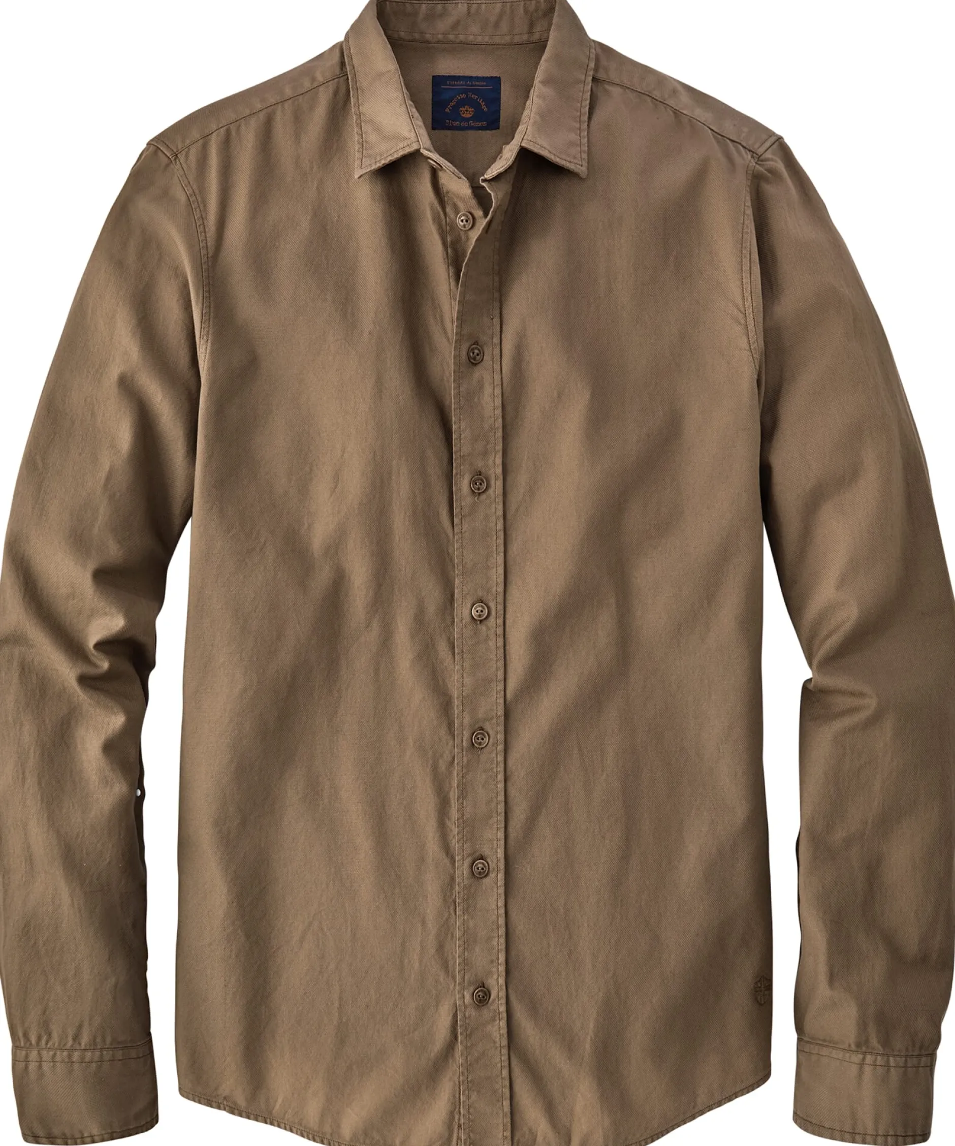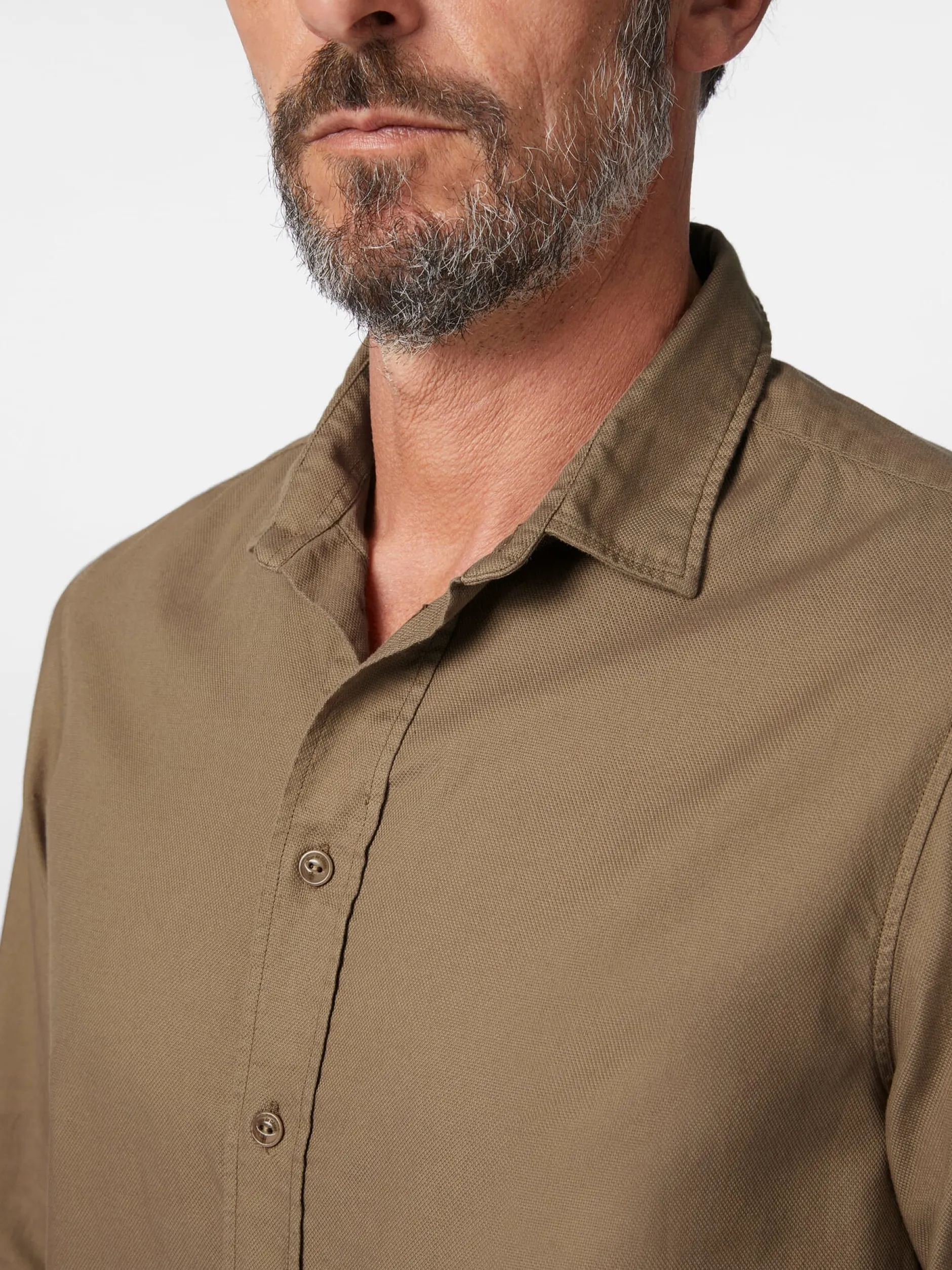 Der griffige Stoff dieses Hemds ist in Leinwandbindung gewebt, was ihm eine feine plastische Oberfläche gibt. Genauer gesagt ist es ein Piqué, dessen markante Struktur sowohl in sportlichen wie in eleganteren Kombinationen gut zur Geltung kommt. Der Schnitt des Hemdes ist geradlinig, mit Kentkragen, abgesetzter Knopfleiste und ohne Brusttasche. Der Rumpfsaum ist gerundet.