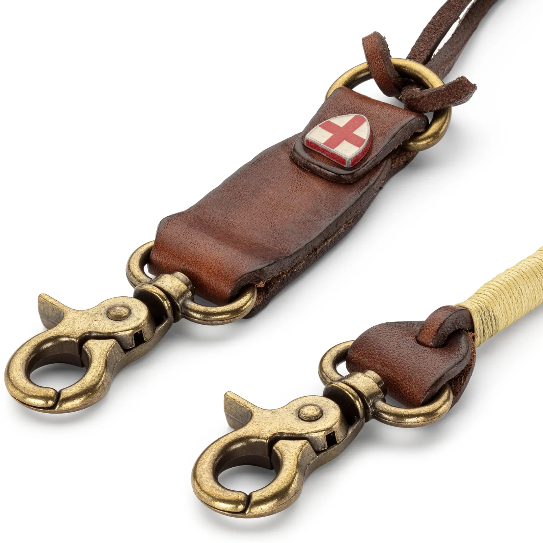Rindleder (Stärke 3,2–3,4 mm), vegetabil gegerbt. Karabiner aus Zink-Aluminium. Baumwollband. Hergestellt in Polen. Komplette Länge inkl. Karabiner 53 cm.