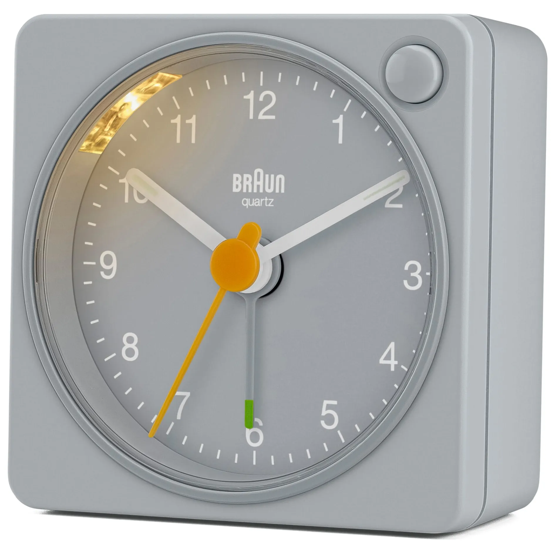 Klassischer analoger Reisewecker von BRAUN, der mit seiner leicht ablesbaren Ziffernblattgrafik sowie dem ikonischen gelben Sekundenzeiger mustergültig für die Designgeschichte von BRAUN steht. Aufgrund seiner kompakten Größe und seiner leichten Bauweise ist er als der perfekte Reisebegleiter zu nutzen. Das ikonische Design dieses klassischen Produkts von BRAUN führt zurück auf den Wecker AB1, der Ende der 80er-Jahre von Dietrich Lubs entworfen wurde. Der Wecker verfügt über ein weiterentwickeltes leiseres Uhrwerk, eine Beleuchtung des Ziffernblatts auf Knopfdruck und nachtleuchtende Stunden- und Minutenzeiger. Mit batteriebetriebenem Quarzuhrwerk für eine AA-Batterie, die nicht im Lieferumfang enthalten ist.