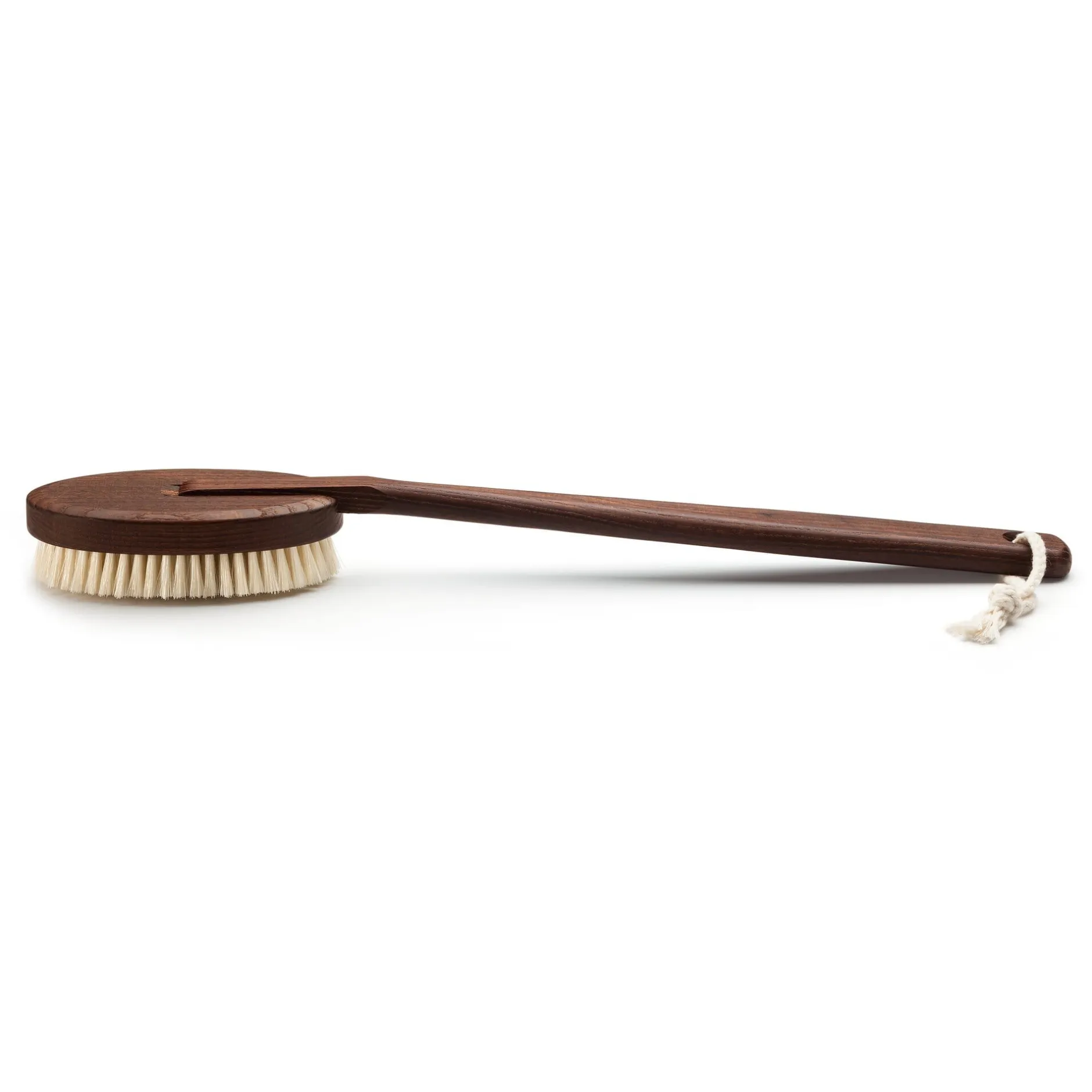 Thermoholz (Esche) geölt. Besatz Schweineborste (Länge 1,8 cm). Kordel aus Baumwolle. Der Griff ist fest mit dem Bürstenkopf verbunden und nicht abnehmbar. Bürstenkopf L 13,5 x B 7,5 cm. Gesamtlänge 45,5 cm. Gewicht 190 g.
