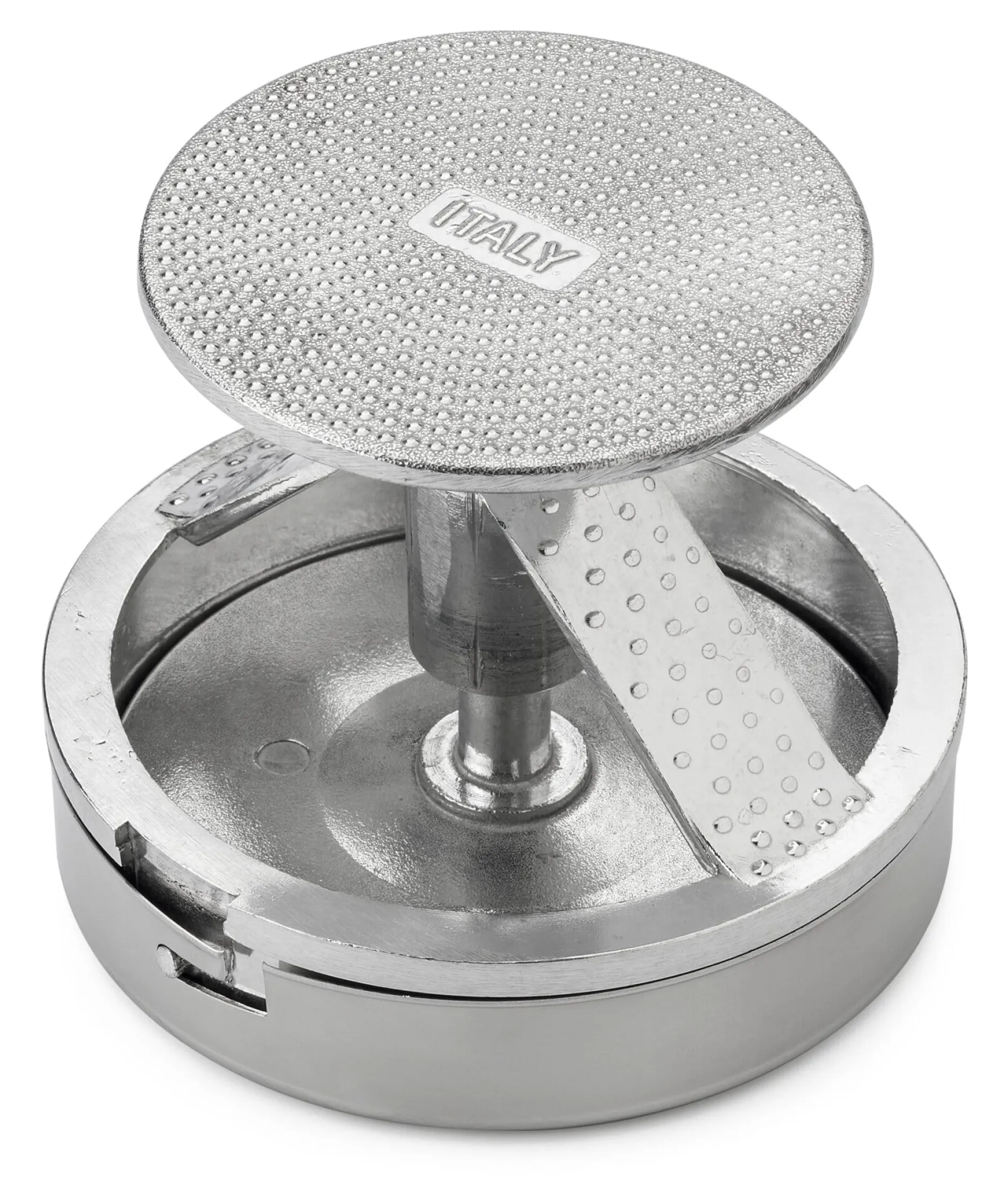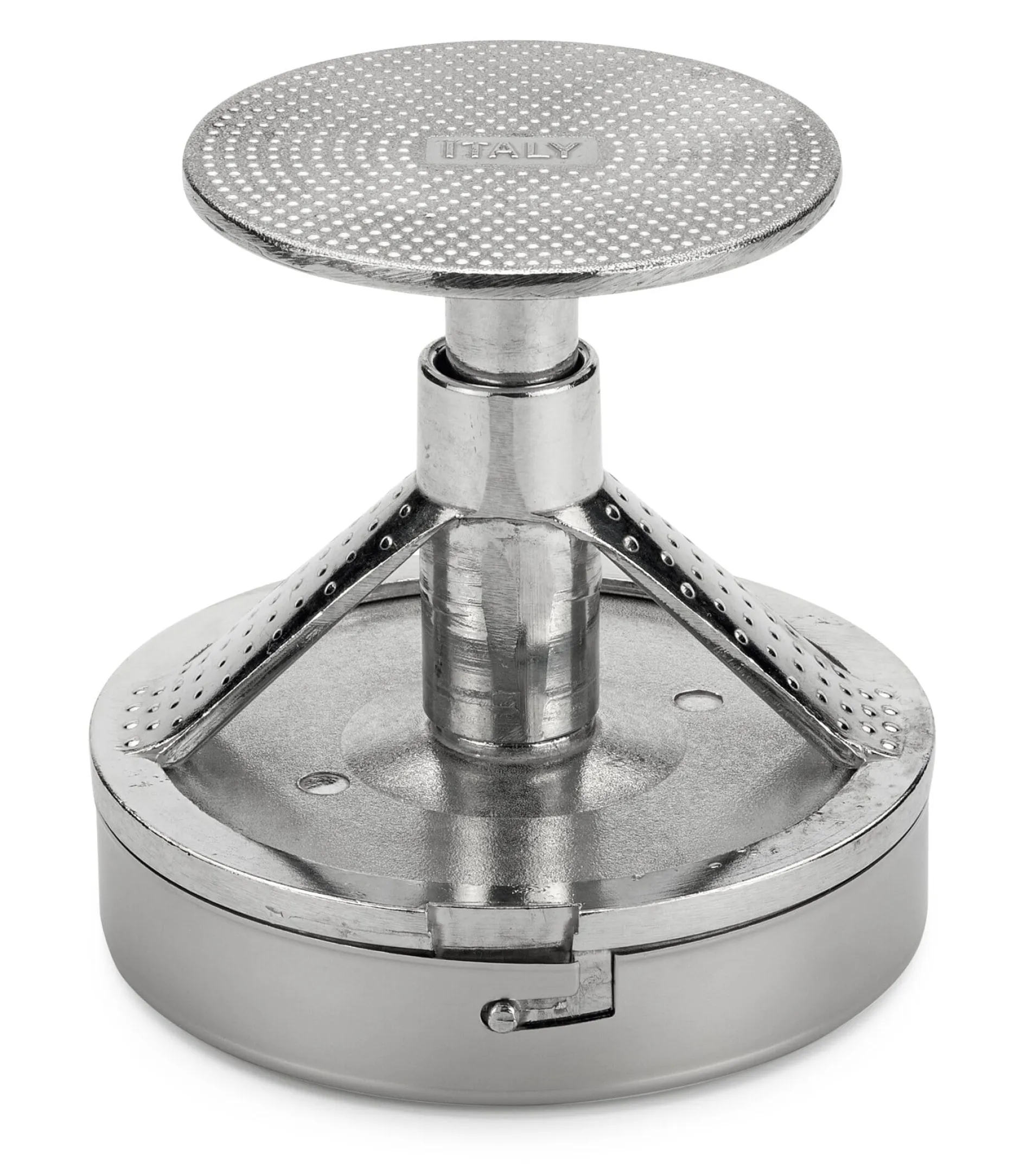 Die Hamburgerpresse aus Aluminiumdruckguss und Edelstahl beziehen wir von einem italienischen metallverarbeitenden Betrieb, der am Ortasee im Piemont bereits seit 50 Jahren Küchenhelfer fertigt. Schon in den Anfängen war man dort mit einem inzwischen zum italienischen Klassiker avancierten Produkt befasst: Man produzierte Teile für die Moka Express von Alfonso Bialetti, die in Italien allgegenwärtige Espressokanne mit dem facettierten Aluminiumkorpus für den Küchenherd.