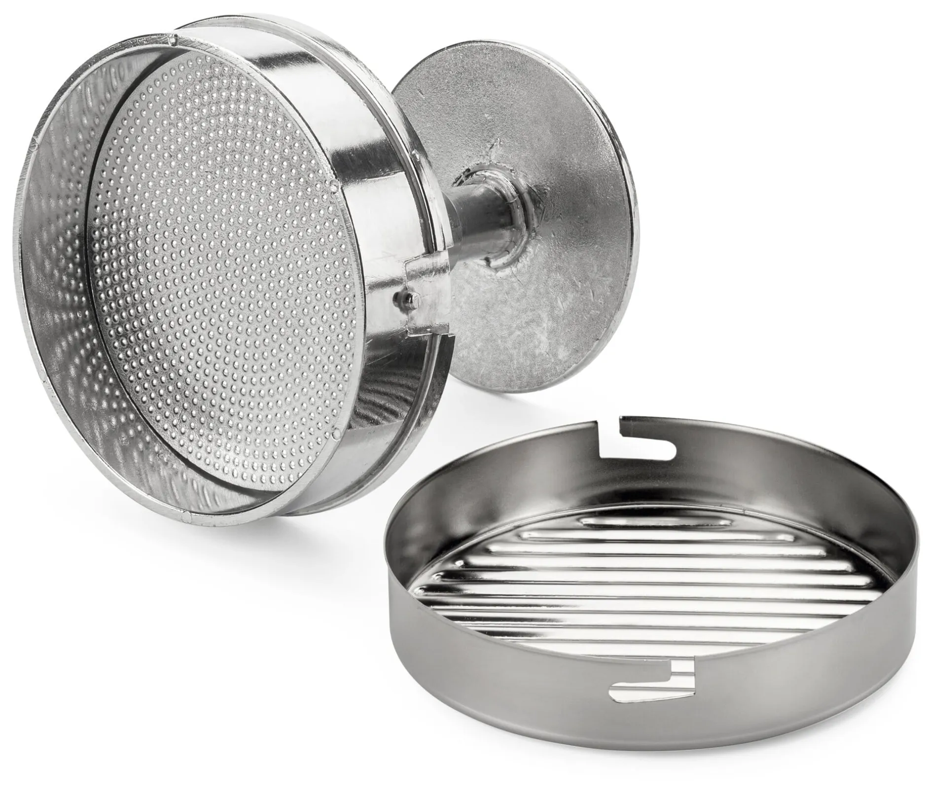 In zwei Schritten zum perfekt geformten Fleischplätzchen, dem sogenannten Burger-Patty, kommt man mit diesem nützlichen Utensil: Die Fleischmasse wird in das Unterteil der Presse gegeben, dann wird das Oberteil aufgesetzt und mit Hilfe des Bajonettverschlusses arretiert. Leichtes Drücken auf den tellerförmigen Griff formt anschließend das Fleisch zu einer gleichmäßigen flachen Scheibe.